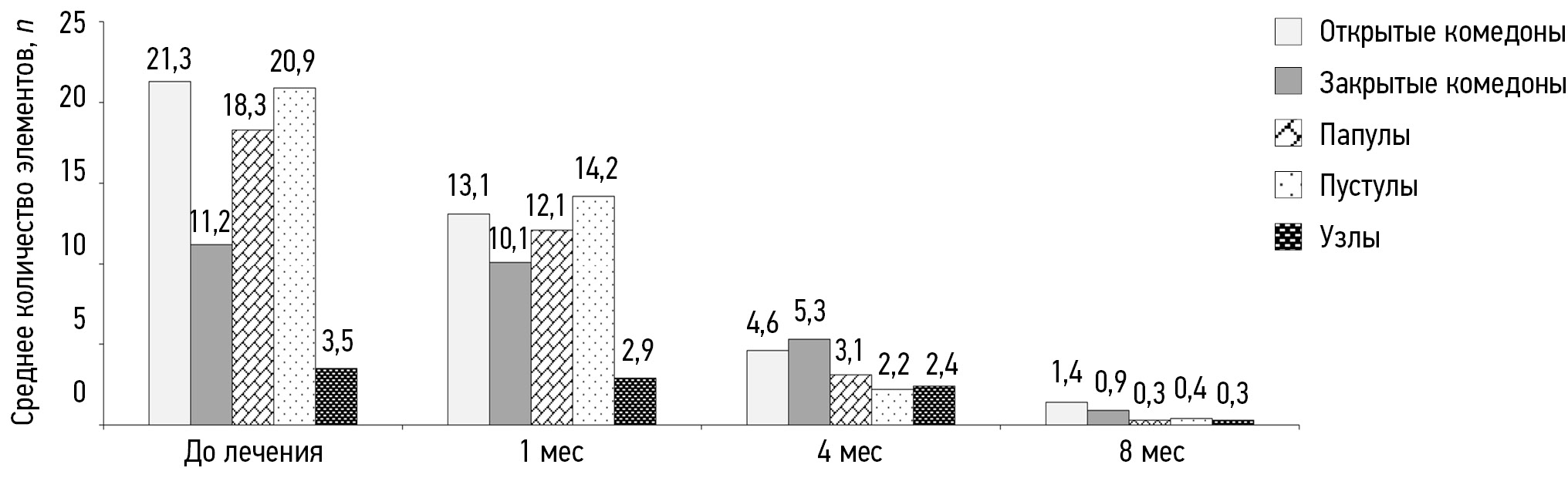 Оценка эффективности терапии включала подсчёт воспалительных и невоспалительных элементов, подсчёт ДИА (табл. 2), степень по шкале IGA до начала терапии и на каждом последующем визите пациентов (1 мес, 4 мес, 8 мес) [27]. Подсчитывали также среднее процентное изменение количества воспалительных и невоспалительных элементов по сравнению с исходным уровнем и долю субъектов, достигших по крайней мере двухбалльного снижения степени по сравнению с исходным уровнем IGA.