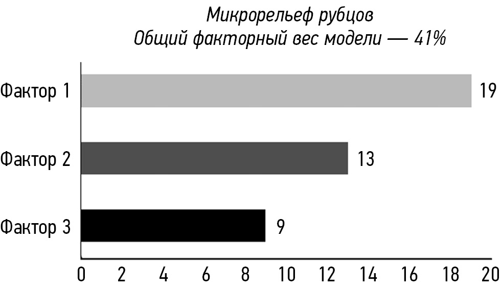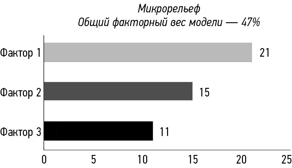 Рис. 5. Удельный вес структуры исходных признаков: глубины и гидратации рубца (фактор 1), этиологического фактора и пигментации (фактор 2), васкуляризации и чувствительности рубца (фактор 3), значимо определяющих дисперсию изменения микрорельефа у пациентов со зрелыми атрофическими рубцами в течение курса высокоинтенсивной лазеротерапии. / Fig. 5. The share of the structure of initial signs: depth and hydration of the scar (factor 1), etiological factor and pigmentation (factor 2), vascularization and sensitivity of the scar (factor 3), that significantly determine the dispersion of changes in the microrelief in patients with mature atrophic scars during the course of high-intensity laser therapy.