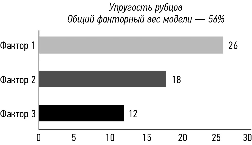 Рис. 4. Удельный вес структуры исходных признаков: показателей эластичности и васкуляризации (фактор 1), фототипа и наличия в анамнезе акне (фактор 2), сроков существования рубца (фактор 3), значимо определяющих дисперсию изменения упругости у пациентов с формирующимися атрофическими рубцами в течение курса высокоинтенсивной лазеротерапии. / Fig. 4. The share of the structure of initial signs: indicators of elasticity and vascularization (factor 1), phototype and history of acne (factor 2), scar life (factor 3), that significantly determine the dispersion of changes in elasticity in patients with developing atrophic scars during the course of high-intensity laser therapy.