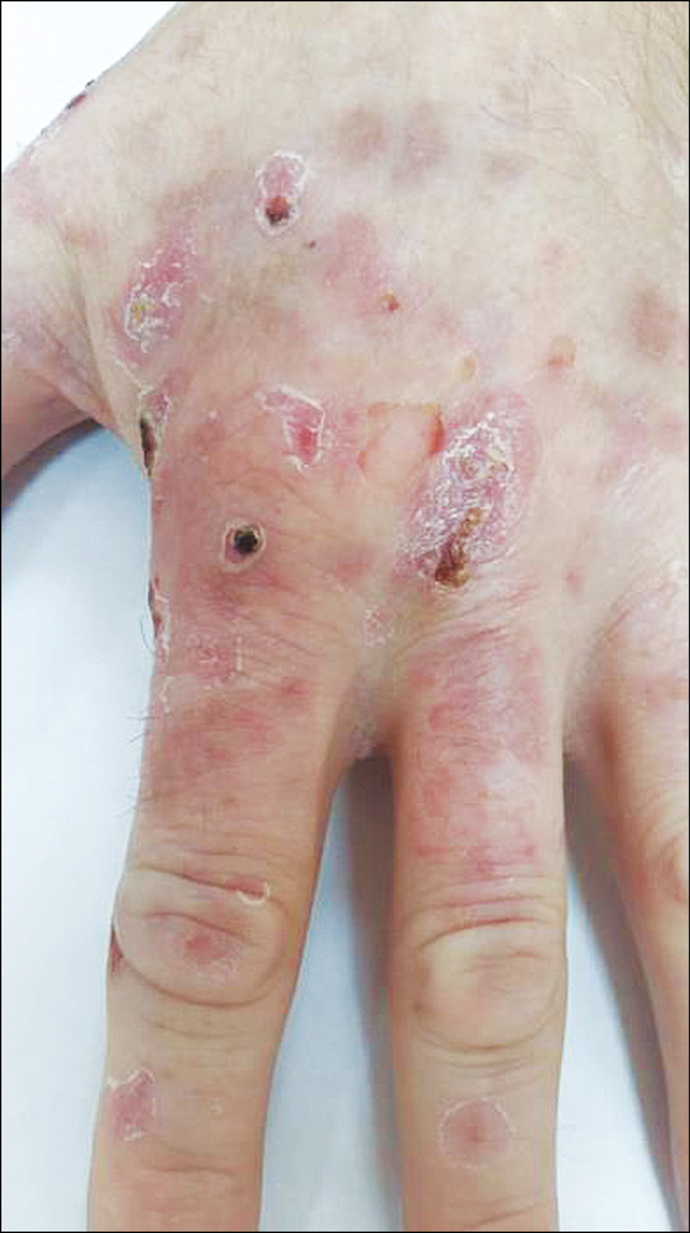 Рис. 1. Поражение кожи кистей рук. / Fig. 1. Skin lesions of the hands.
