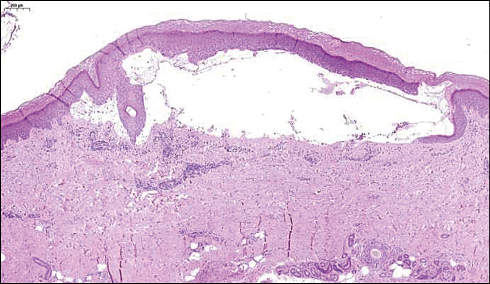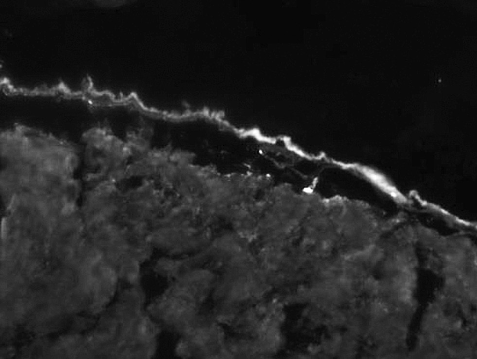 Результаты физикального, лабораторного и инструментального исследования. При постановке реакции иммунофлюоресценции определяется линейное отложение IgG, IgM вдоль базальной мембраны. В реакциях с антителами IgA свечения нет (рис. 2). При гистохимическом исследовании обнаружены субэпидермальные пузыри, состоящие из малодифференцированных фибробластов; в верхней части дермы и утолщённых стенках капилляров имеются отложения гиалина (рис. 3). В стенках сосудов выявлены ШИК*-положительные диастазорезистентные вещества (рис. 4).