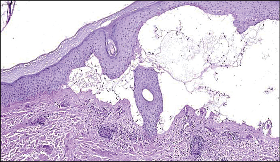 Другим инструментом служит биопсия кожи, которая обычно не требуется для диагностики данного заболевания, но помогает при дифференциальной диагностике. При этом в литературных источниках сообщается, что результатом данного исследования при кожных порфириях, как правило, является гистологическая картина субэпидермальных пузырей и отложений иммунных комплексов [9], что соответствует гистологической картине результатов биопсии пациента в представленном клиническом случае.