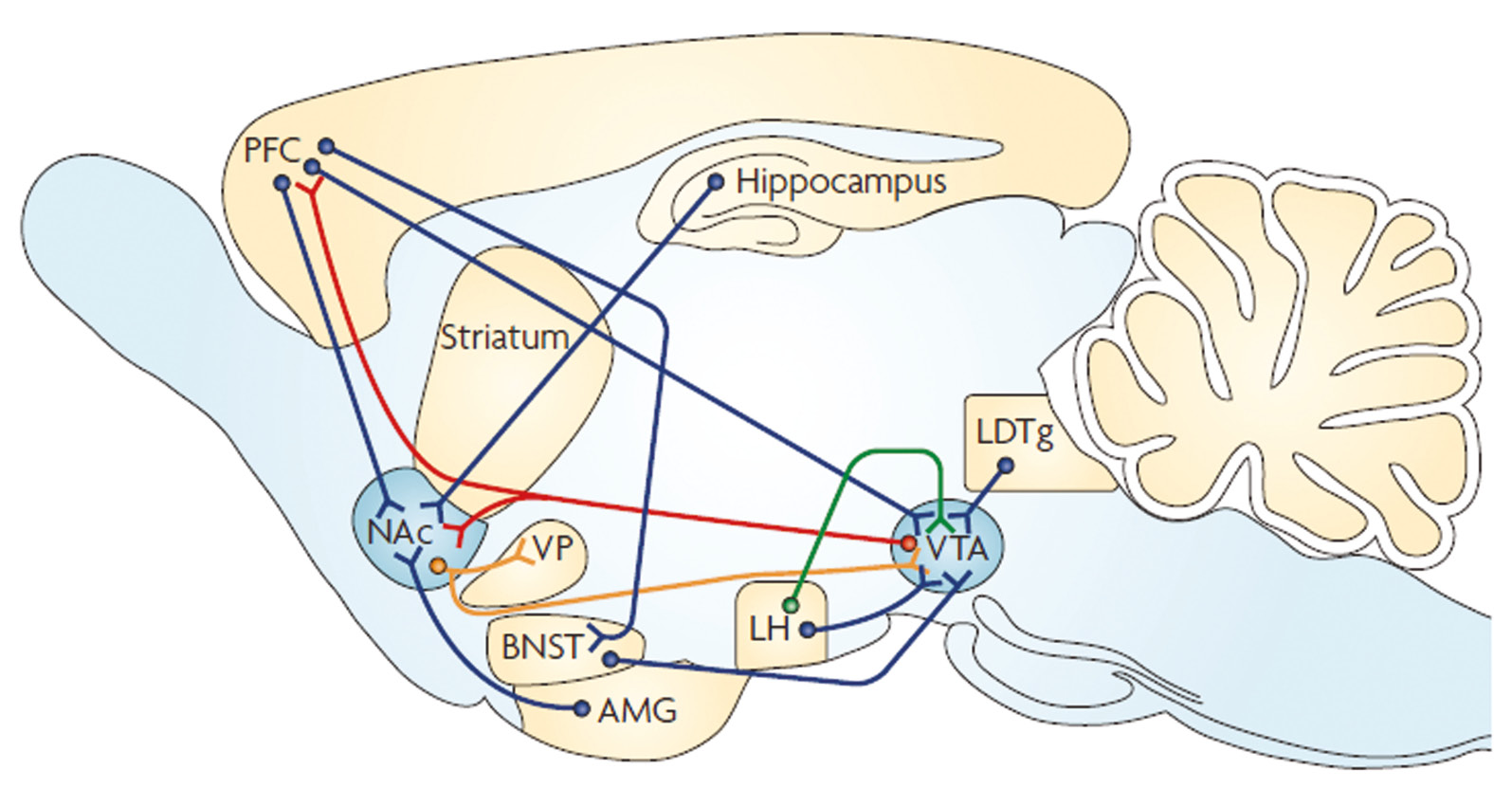 Хотя мозговая схема, лежащая в основе зависимости, сложна, однозначно то, что мезолимбическая дофаминовая система, состоящая из VTA и NAC, а также связанные лимбические структуры (рис. 1) являются критическими субстратами для нейронной адаптации, лежащей в основе зависимости [44, 45].