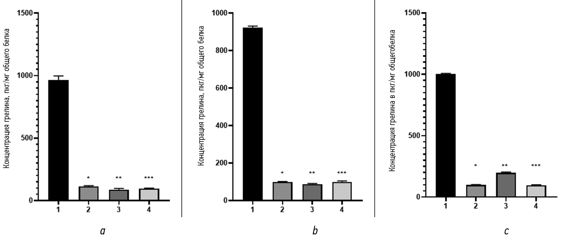 Рисунок. Содержание грелина в переднем (a), среднем (b) и заднем (c) мозге Danio rerio после контакта с хищником и инкубации с окситоцином и антагонистами грелина: 1 — контакт с хищником (в группе В — введение кортиколиберина); 2 — хищник + окситоцин; 3 — хищник + агрелакс; 4 — хищник + [D-Lys3]-GHRP-6. *p < 0,05 относительно группы 1 / Figure. Ghrelin levels in the forebrain (a), midbrain (b), and hindbrain (c) of Danio rerio (pg/mg total protein) after contact with a predator and incubation with oxytocin and ghrelin antagonists: 1 — contact with a predator (in group B, administration of corticotrophin-releasing hormone); 2 — predator + oxytocin; 3 — predator + agrelax; 4 — predator + [D-Lys3]-GHRP-6. *, ** p < 0.05 relative to group 1