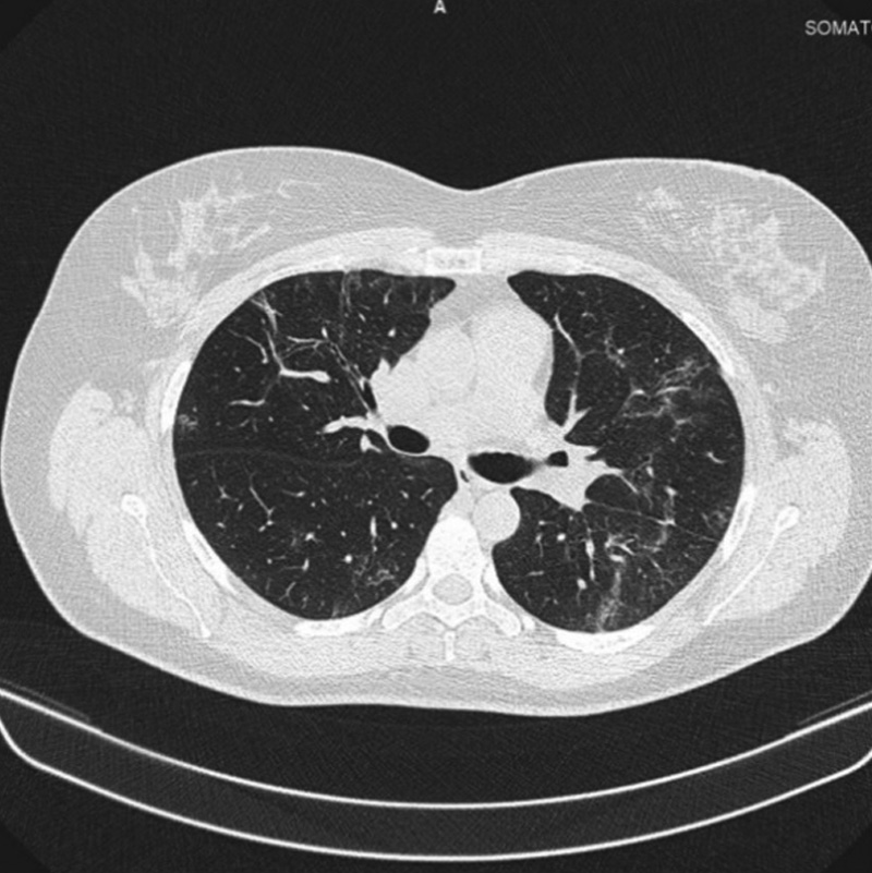 Через 1,5 нед. после начала заболевания — госпитализация в профильное (по лечению COVID-19) отделение стационара. Отмечалось снижение сатурации кислорода до 70 %, повышение температуры до 39,6 °С. На КТ органов грудной клетки (ОГК) при госпитализации: в паренхиме легких с обеих сторон участки уплотнения паренхимы по типу «матового стекла» с признаками консолидации, расположенные субплеврально и перибронхиально.