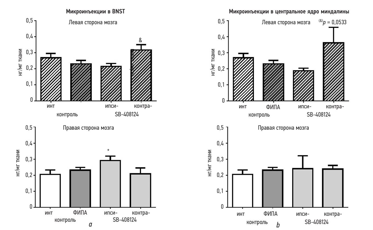 Рис. 6. Аналогичные изменения содержания 5-гидроксииндолуксусной кислоты (5-ГИУК) в стриатуме под влиянием унилатеральных микроинъекций SB-408124 в ядро ложа конечной полоски (bed nucleus of the stria terminalis — BNST) (а) и центральное ядро миндалины (b): правостороннее введение антагониста орексина вызывает повышение 5-ГИУК в левом (контралатеральном) стриатуме по сравнению с животными, получавшими ФИПА. Группы животных: инт — интактные, ФИПА — после внутрибрюшинного введения ФИПА (1 мг/кг веса), ипси- — после микроинъекции SB-408124 на соответствующей стороне мозга, контра- — после микроинъекции с противоположной стороны. *p < 0,05 — достоверные отличия от соответствующего показателя, измеренного у интактных животных. &p < 0,05; (&)p = 0,0533 — отличия от соответствующего показателя у крыс, получавших ФИПА — по результатам ANOVA