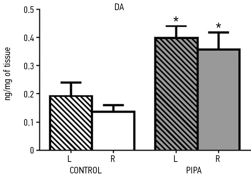 Fig. 1. Changes in the level of dopamine (DА) in the olfactory tubercle under the action of β-phenylisopropylamine. Animal groups: control, received physiological solution; PIPA, received β-phenylisopropylamine. The shaded bars (L) show the value of the corresponding parameter in the left hemisphere and the unshaded (R) in the right hemisphere. *p < 0.05, significant differences from the corresponding parameter measured in intact animals by Student’s t-test