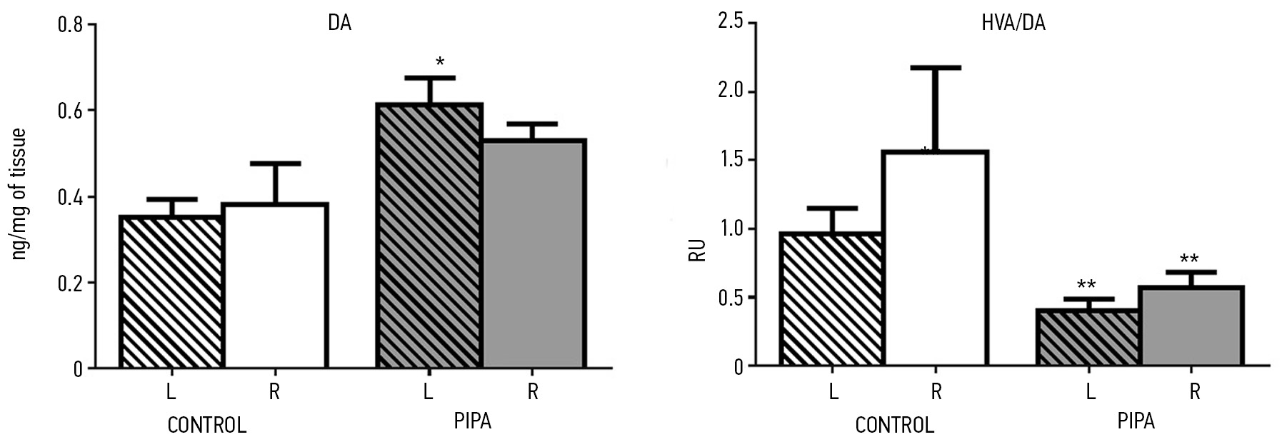 In the prefrontal cortex, PIPA significantly decreased the levels of 5-HIAA (p < 0.05; Fig. 3 and Tables 1 and 5). In the hippocampus, PIPA did not induce statistically significant changes in monoamine metabolism indices but led to the right-sided asymmetry with a predominance of DA, 5-HT, and 5-HIAA levels (p < 0.05; Fig. 4 and Tables 2 and 6).