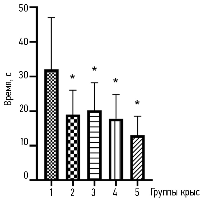Рис. 1. Время нахождения в светлом рукаве приподнятого крестообр азного лабиринта: по оси ординат — время (с), по оси абсцисс — группы крыс: 1 — контроль (интактные); 2 — крысы с ПТСР; 3 — крысы с ПТСР + бусерелин; 4 — крысы с ПТСР + кисспептин-10 интраназально; 5 — крысы с ПТСР + йохимб ин. *p < 0,05 к контролю