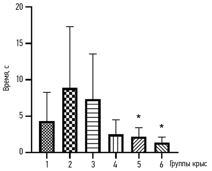 Рис. 2. Латентное время до первой попытки достичь самки в тесте аппетентного поведения: по оси ординат — время (с), по оси абсцисс — группы крыс: 1 — контроль (интактные); 2 — крысы с ПТСР; 3 — крысы с ПТСР + бусерелин; 4 — крысы с ПТСР + кисспептин-10 внутрибрюшинно; 5 — крысы с ПТСР + кисспептин-10 интраназально; 6 — крысы с ПТСР + йохимбин. *p < 0,05 к контролю.