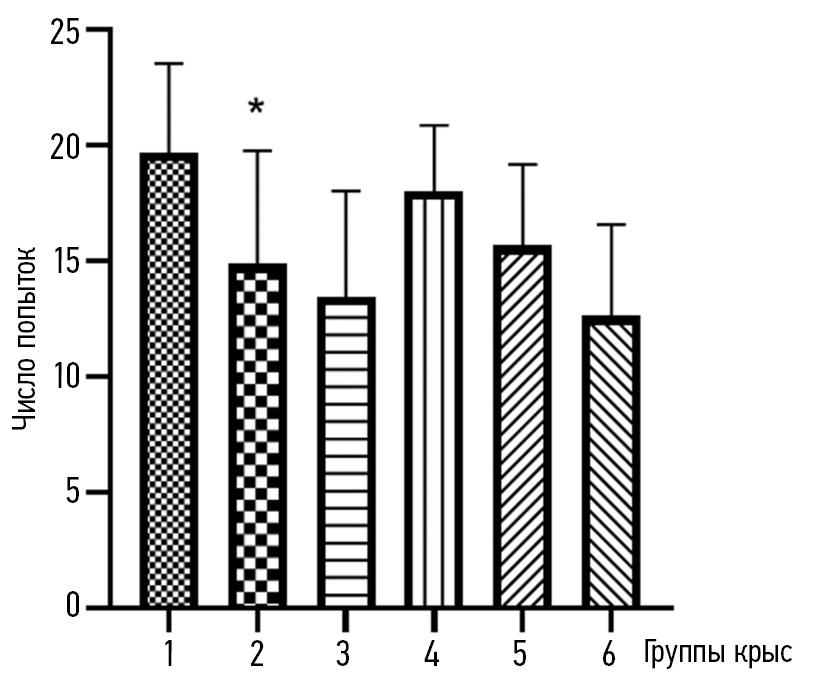 Fig. 3. Number of attempts to reach the female in the appetitive behavior test. The ordinate and abscissa axes show the number of attempts and groups of rats, respectively: 1 — control (intact); 2 — rats with PTSD; 3 — rats with PTSD + buserelin; 4 — rats with PTSD + kisspeptin-10 intraperitoneally; 5 — rats with PTSD + kisspeptin-10 intranasally; 6 — rats with PTSD + yohimbine. *p < 0. 05 to control