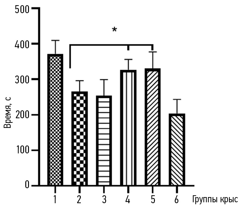 Рис. 4. Время, проведенное возле самки, в тесте аппетентного поведения: по оси ординат — время (с), по оси абсцисс — группы крыс: 1 — контроль (интактные); 2 — крысы с ПТСР; 3 — крысы с ПТСР + бусерелин; 4 — крысы с ПТСР + кисспептин-10 внутрибрюшинно; 5 — крысы с ПТСР + кисспептин-10 интраназально; 6 — крысы с ПТСР + йохимбин. *p < 0,05 между 2-й и 5-й группами.