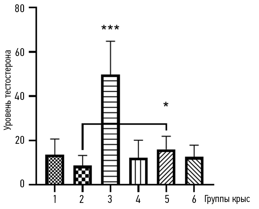 Рис. 5. Уровень тестостерона в сыворотке крови крыс: по оси ординат — уровень тестостерона (мкг/л), по оси абсцисс — группы крыс: 1 — контроль (интактные); 2 — крысы с ПТСР; 3 — крысы с ПТСР + бусерелин; 4 — крысы с ПТСР + кисспептин-10 внутрибрюшинно; 5 — крысы с ПТСР + кисспептин-10 интраназально; 6 — крысы с ПТСР + йохимбин. *p < 0,05 между 2-й и 5-й группами, ***р < 0,01 ко всем группам, кроме 3-й