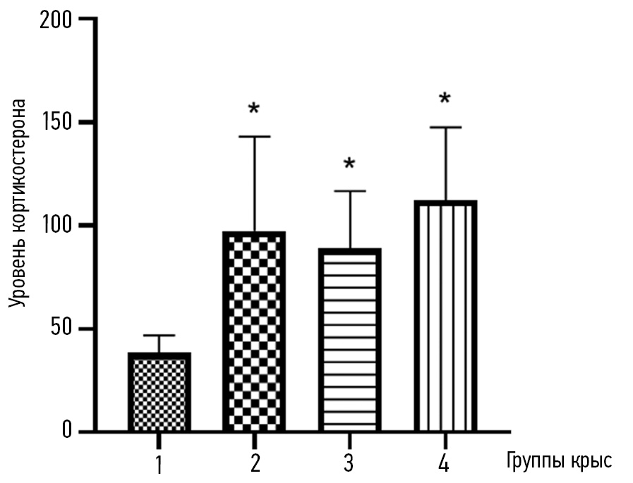 Рис. 6. Уровень кортикостерона в сыворотке крови крыс: по оси ординат — уровень кортикостерона (мкг/л), по оси абсцисс — группы крыс: 1 — контроль (интактные); 2 — крысы с ПТСР; 3 — крысы с ПТСР + бусерелин; 4 — крысы с ПТСР + кисспептин-10 интраназально. *p < 0,05 к контролю.