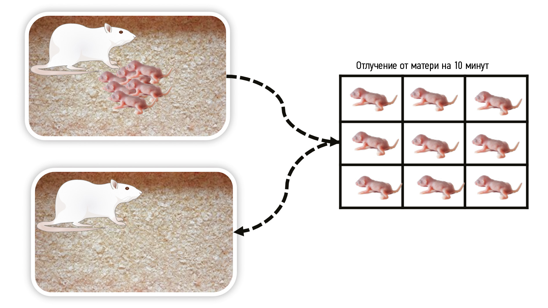 Модель отлучения от матери. Крысят со 2-й по 12-й день постнатального периода помещали в индивидуальные пластиковые стаканчики на 180 мин в течение 10 последовательных дней. Зрительный контакт с матерью был исключен. После материнской депривации и молочного вскармливания крысят выращивали в стандартных клетках по 5 особей в каждой. В опыте использовали самцов в возрасте 90–100 дней весом 200–250 г.