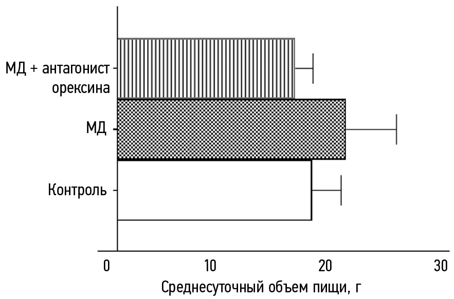 Моделирование клинических проявлений компульсивного переедания на животных предоставляет ряд данных для понимания механизмов пищевого поведения. Например, участие гормональных и медиаторных механизмов в формировании положительных эмоциональных состояний при компульсивном переедании. В эти процессы вовлечены дофаминовая и серотониновая системы, а также пептиды головного мозга [12]. В настоящем исследовании на примере орексина показано, что в механизмы компульсивного переедания вовлечена и система орексигенных пептидов. Орексин в первую очередь действует на систему регуляции метаболического питания в гипоталамусе, где он образуется, и активирует пищевое поведение. Роль орексина в экстрагипоталамических отделах мозга заключается в его действии на высшие функции мозга, подкрепление и мотивацию, страх и депрессию [13].