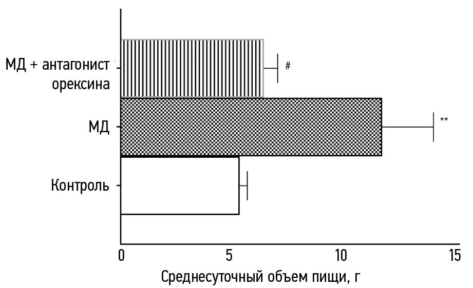Рис. 3. Влияние материнской депривации (МД) на потребление высококалорийной пищи при выдаче шоколада 3 раза в неделю. Показано среднее суточное потребление. ** — p < 0,001 относительно контрольной (интактной) группы животных; # — p < 0,05 относительно группы животных, переживших материнскую депривацию