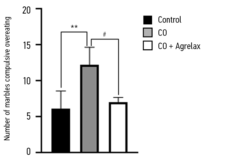 In this study of compulsive behavior using the marble burying test, the experimental group of animals that received additional high-calorie food buried a significantly greater number of marbles (p < 0.01) compared to the control group. This indicates increased compulsive behavior and confirms the development of compulsive overeating. After a 7-day course of Agrelax administration, the number of buried marbles significantly decreased, reaching the control group values (p < 0.05), which indicates an improvement in the compulsive behavior manifestations (Fig. 1).