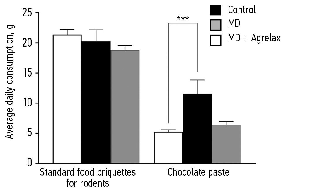 Рис. 4. Оценка действия нового антагониста грелиновых рецепторов агрелакса на потребление стандартного корма и компульсивное переедание у крыс, выращенных в условиях материнской депривации (MD). Показано среднее суточное потребление. ***p < 0,001 относительно контрольной (интактной) группы животных