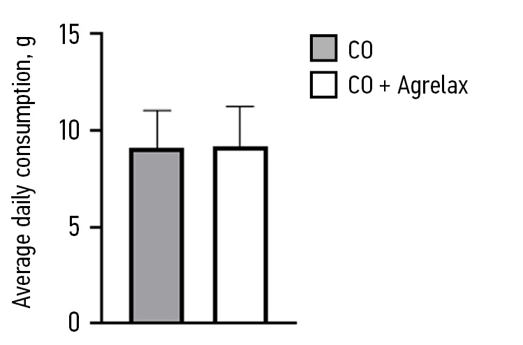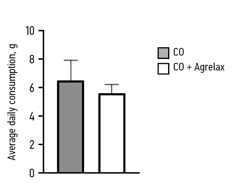 Fig. 2. Effects of agrelax on the consumption of standard pelleted and high-calorie food in the compulsive overeating rat model (CO). *p < 0,05