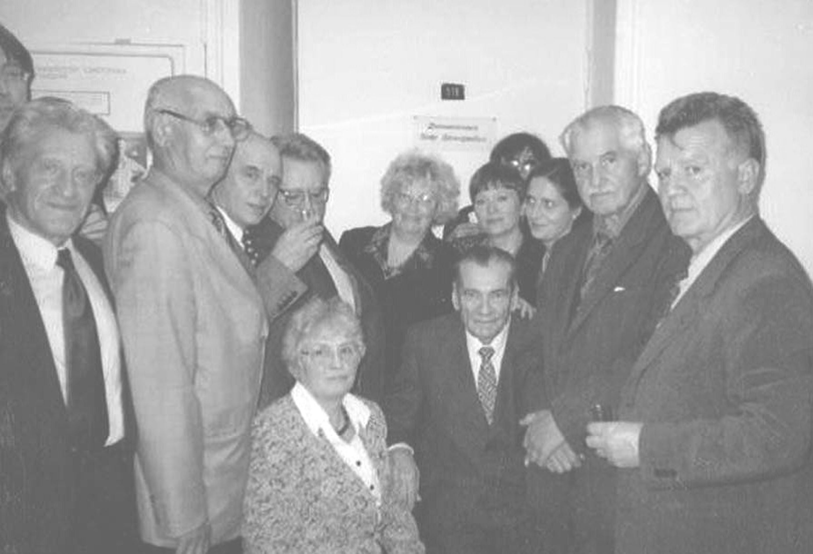 Fig. 5. At the meeting of St. Petersburg Pharmacological Society (2003) dedicated to P.P. Denisenko’s 80th anniversary. Front row, left to right: Prof. V.E. Ryzhenkov, Academician Prof. Yu.D. Ignatov, Prof. A.T. Burbello (seated), Prof. P.P. Denisenko (seated), Prof. N.A. Losev, Prof. G.I. Dyachuk