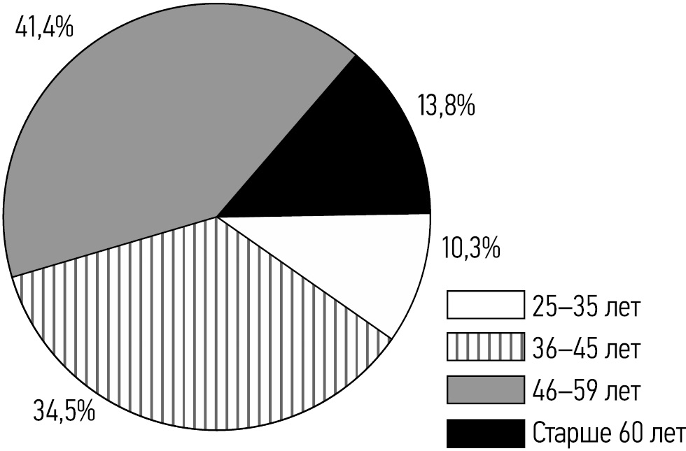 Возрастная структура опрошенных врачей следующая: 10,3% респондентов в возрасте от 25 до 35 лет, 34,5% — от 36 до 45 лет, 41,4% — от 46 до 59 лет, 13,8% — старше 60 лет (рис. 1).