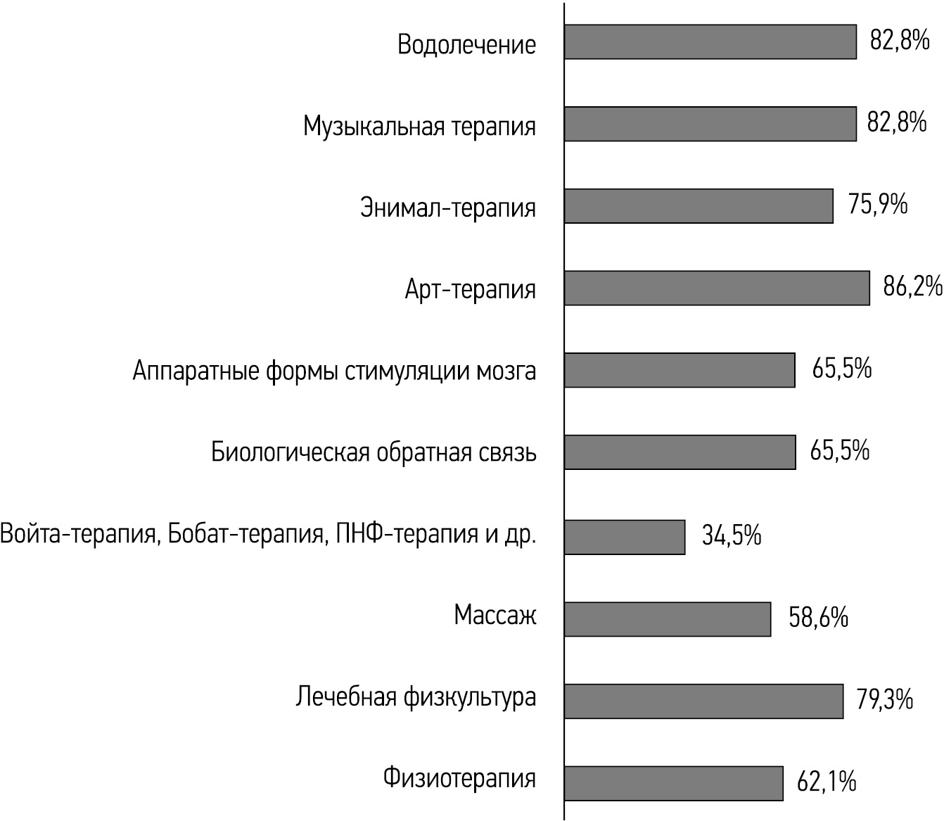 В вопросах немедикаментозного лечения пациентов с РАС лидирующие позиции заняли следующие направления: арт-терапия, водолечение, музыкальная терапия, лечебная физкультура и энимал-терапия, или зоотерапия (рис. 3). Вышеуказанные терапевтические методы широко известны и с успехом применяются у детей с РАС. Интересно отметить, что методы с доказанной эффективностью у данной категории пациентов, такие как транскраниальные формы стимуляции мозга (транскраниальная микрополяризация, транскраниальная магнитная стимуляция) и биологическая обратная связь, выбрали лишь 65,5% респондентов [12–14]. На возможность применения Бобат-терапии (методика Берты и Карла Бобат), Войта-терапии (физиотерапевтический метод профессора Войты) и PNF-терапии (proprioceptive neuromuscular facilitation ― метод стимуляции проприоцептивного аппарата для улучшения качества движения) у пациентов с РАС указали 34,5% респондентов. Данные опроса свидетельствуют о недостаточной осведомлённости врачей в области современных методик физической и реабилитационной медицины, которые можно успешно применять у детей с РАС.