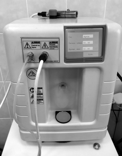 Для проведения процедур обработки воздушно-плазменным потоком в работе физиотерапевтического отделения Клиники имени профессора Ю.Н. Касаткина Российской медицинской академии непрерывного профессионального образования (ФГБОУ ДПО РМАНПО Минздрава России) используется разрешенное к применению изделие для терапии аргоновой плазмой «Плазма-200» (производство ЗАО «Руднев-Шиляев», Россия, регистрационное удостоверение № РЗН 2019/8192 от 11.03.2019 г.) (рис. 1). Процедуры НТП проводятся пациентам онкологического профиля с опухолями различных локализаций, в том числе возникшими нежелательными лучевыми реакциями [12].