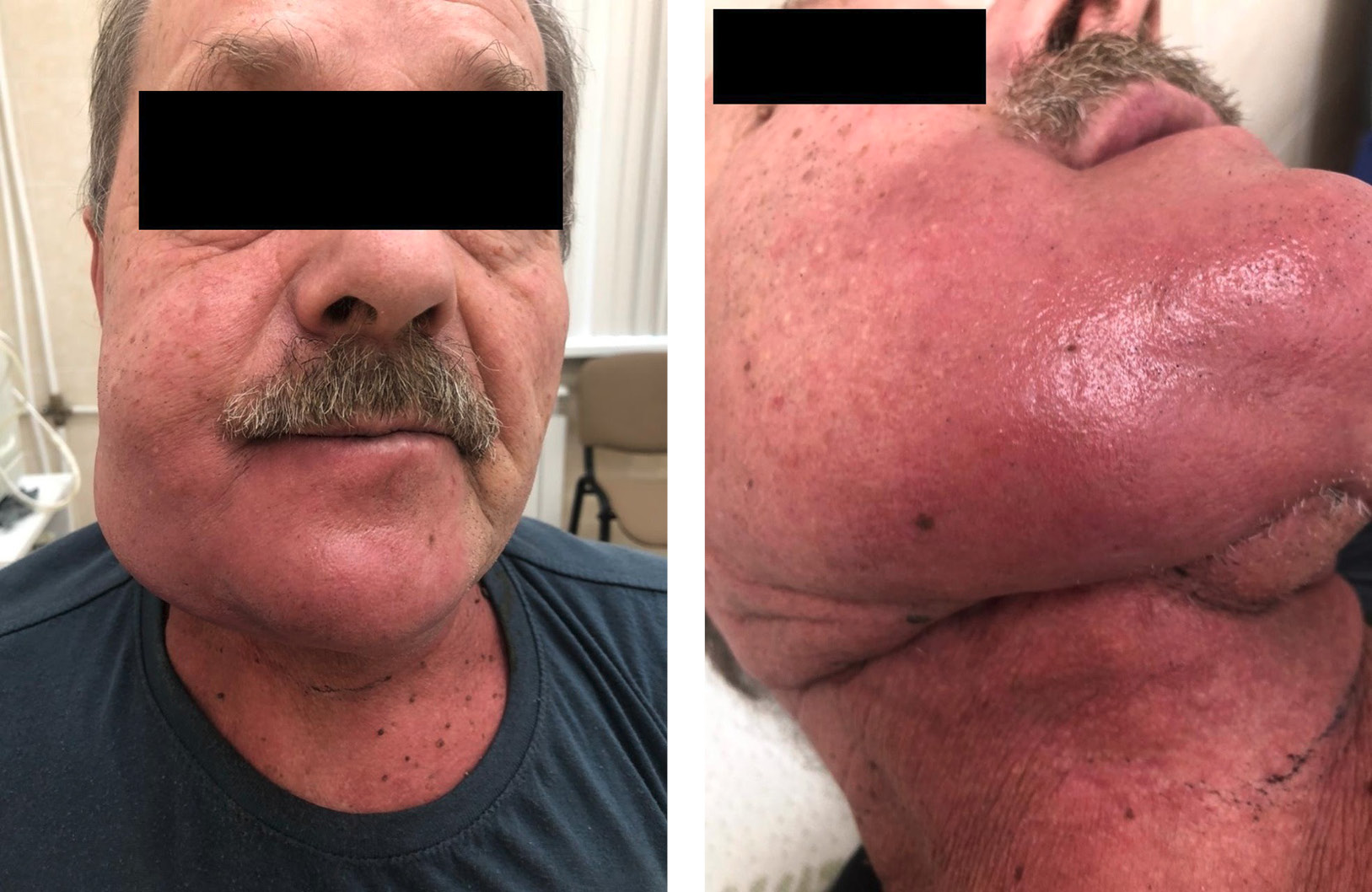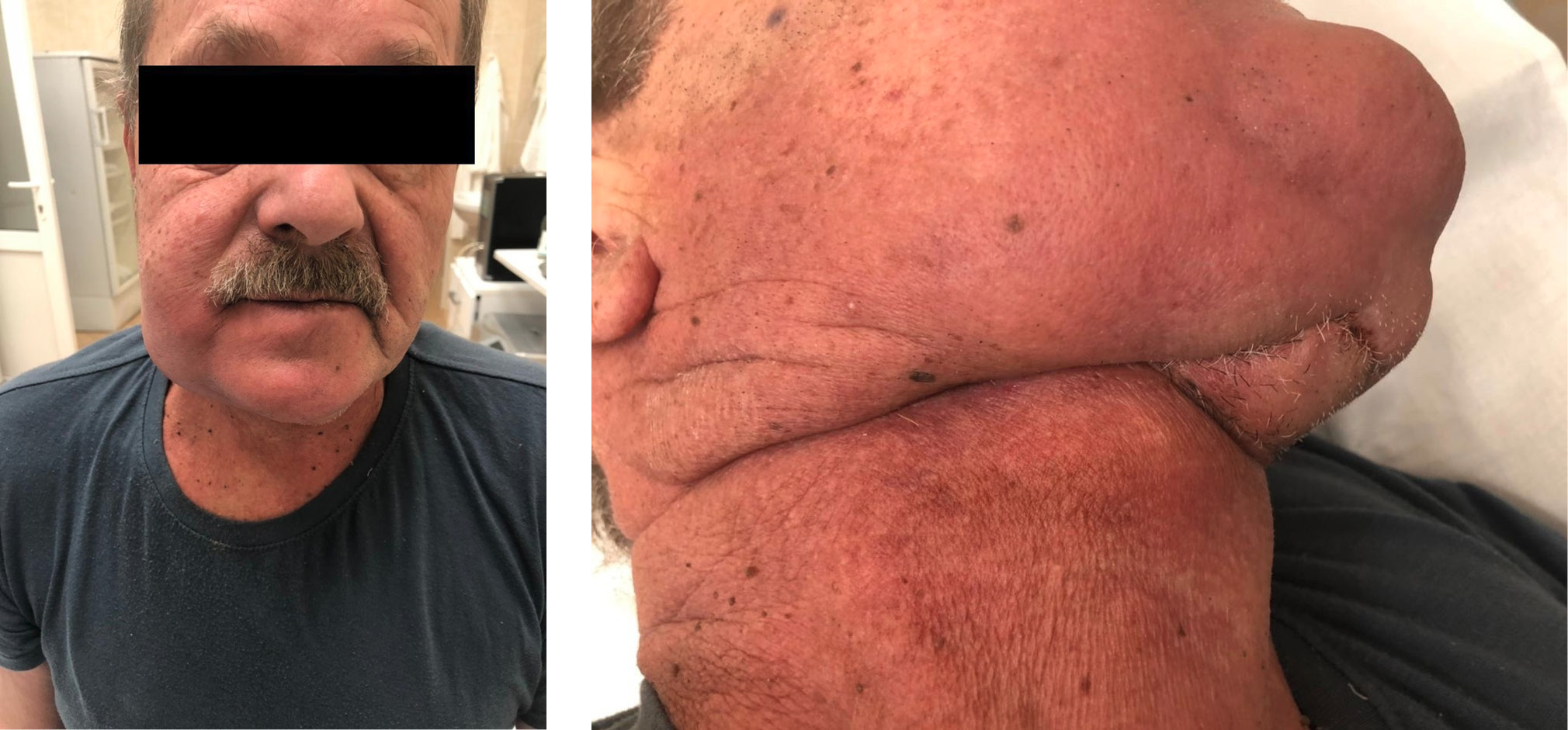При поступлении в Клинику имени профессора Ю.Н. Касаткина ФГБОУ ДПО РМАНПО Минздрава России 23.04.2021 г. на курс ДЛТ пациент предъявлял жалобы на общую слабость, болезненность в области послеоперационного рубца в подчелюстной области.