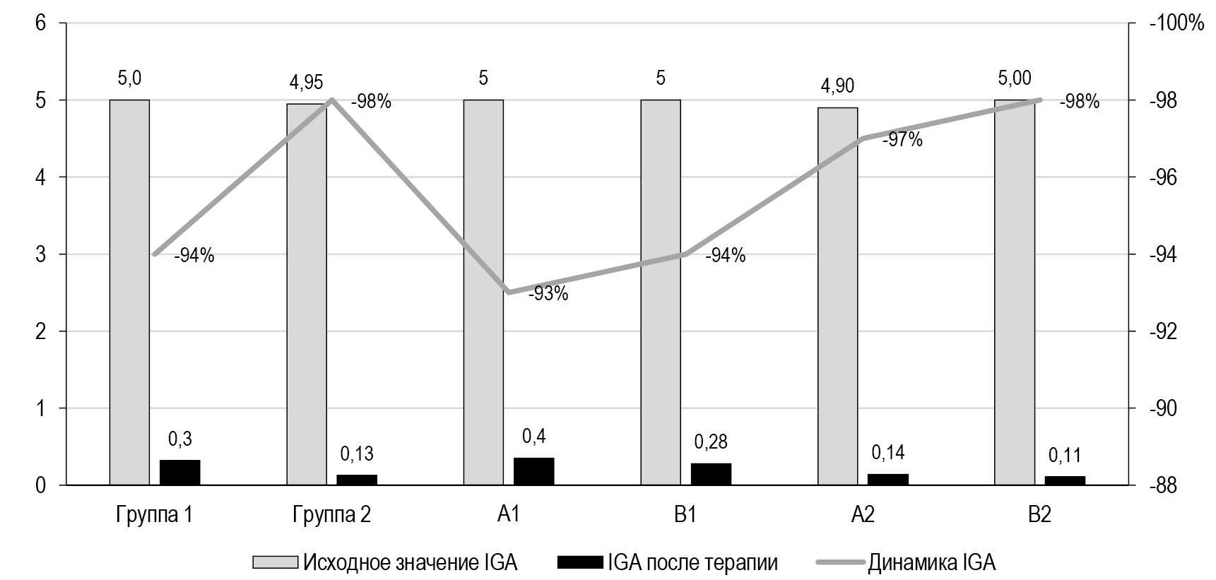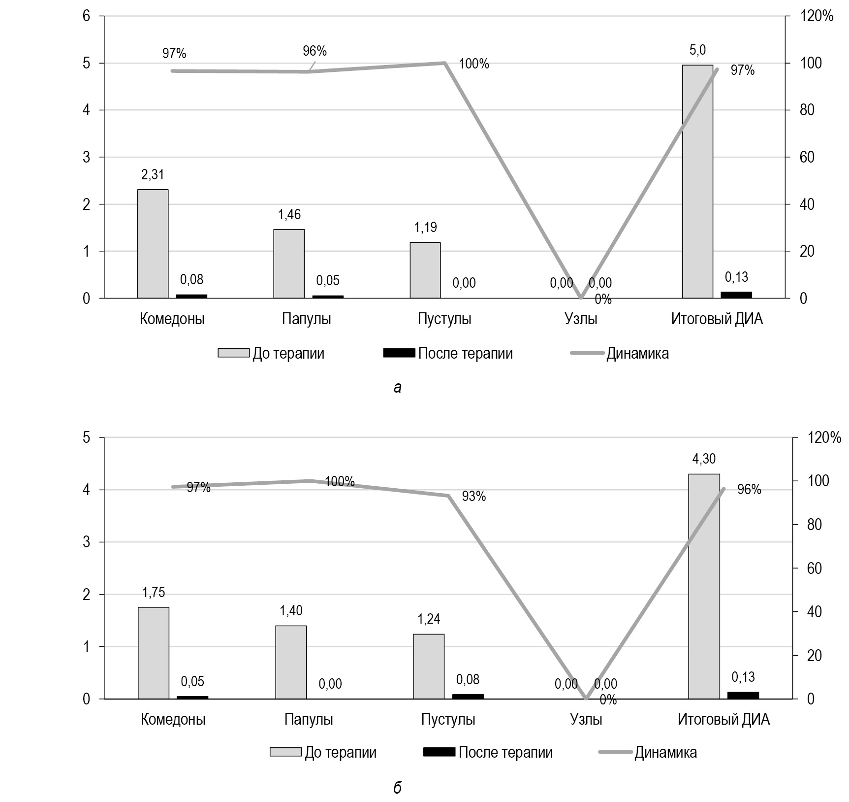 В группах исследования была продемонстрирована сходная динамика ДИА —регресс на 97% (группа 1) и 96% (группа 2) в основном за счёт уменьшения количества комедонов и папул, что говорит о высокой эффективности обоих методов терапии.