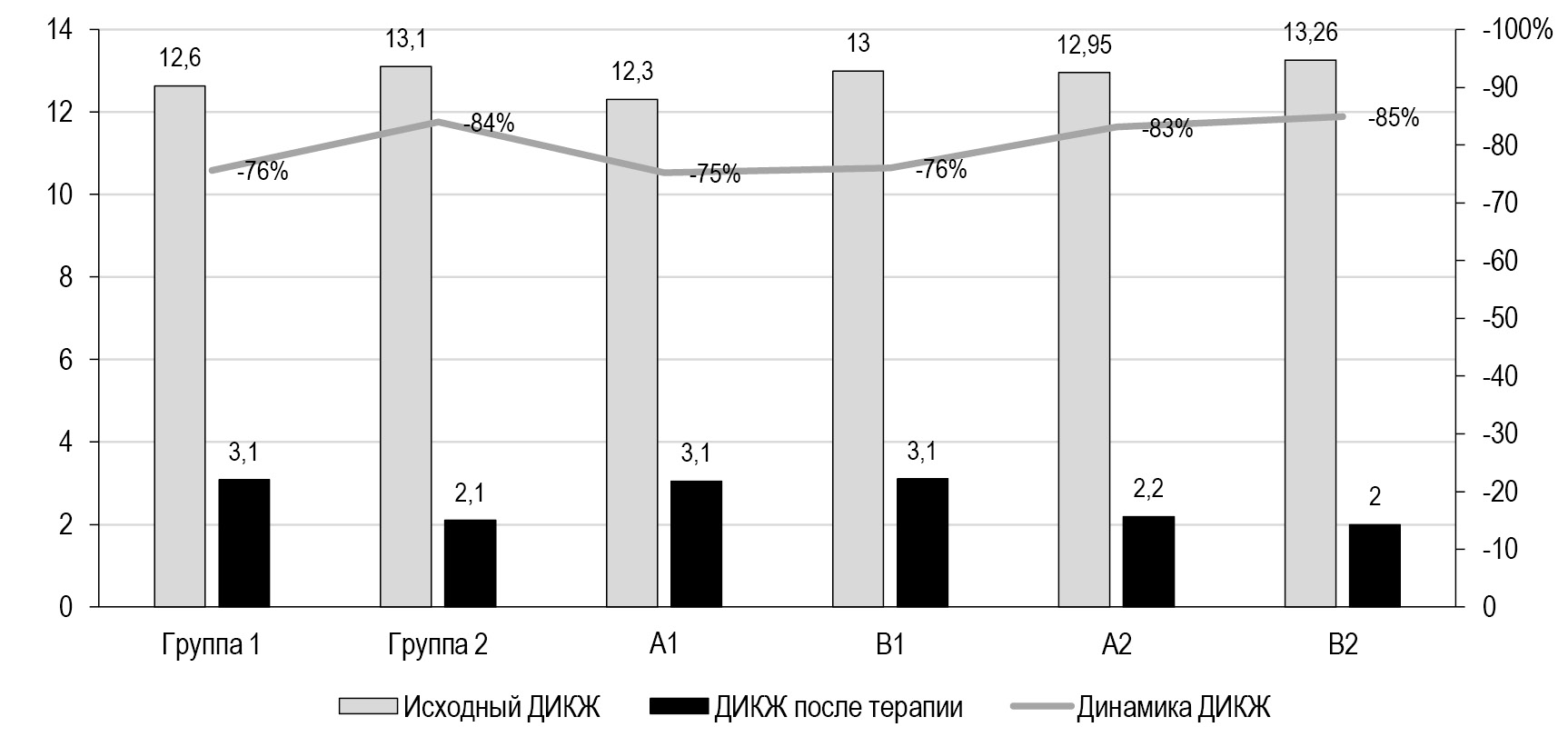 Среднее значение ДИКЖ в исследуемых группах до лечения составляло 12,6 в группе 1 и 13,1 в группе 2 (рис. 2), что свидетельствует о существенном воздействии на жизнь пациентов. В группе пациентов, получавших комбинированный метод лечения низкими дозами изотретиноина и широкополосным некогерентным светом (IPL), отмечалась более выраженная динамика ДИКЖ по сравнению с группой пациентов, получавших монотерапию стандартными дозами изотретиноина, — 76 и 84% соответственно (при p <0,05, сравнение с показателями до лечения).
