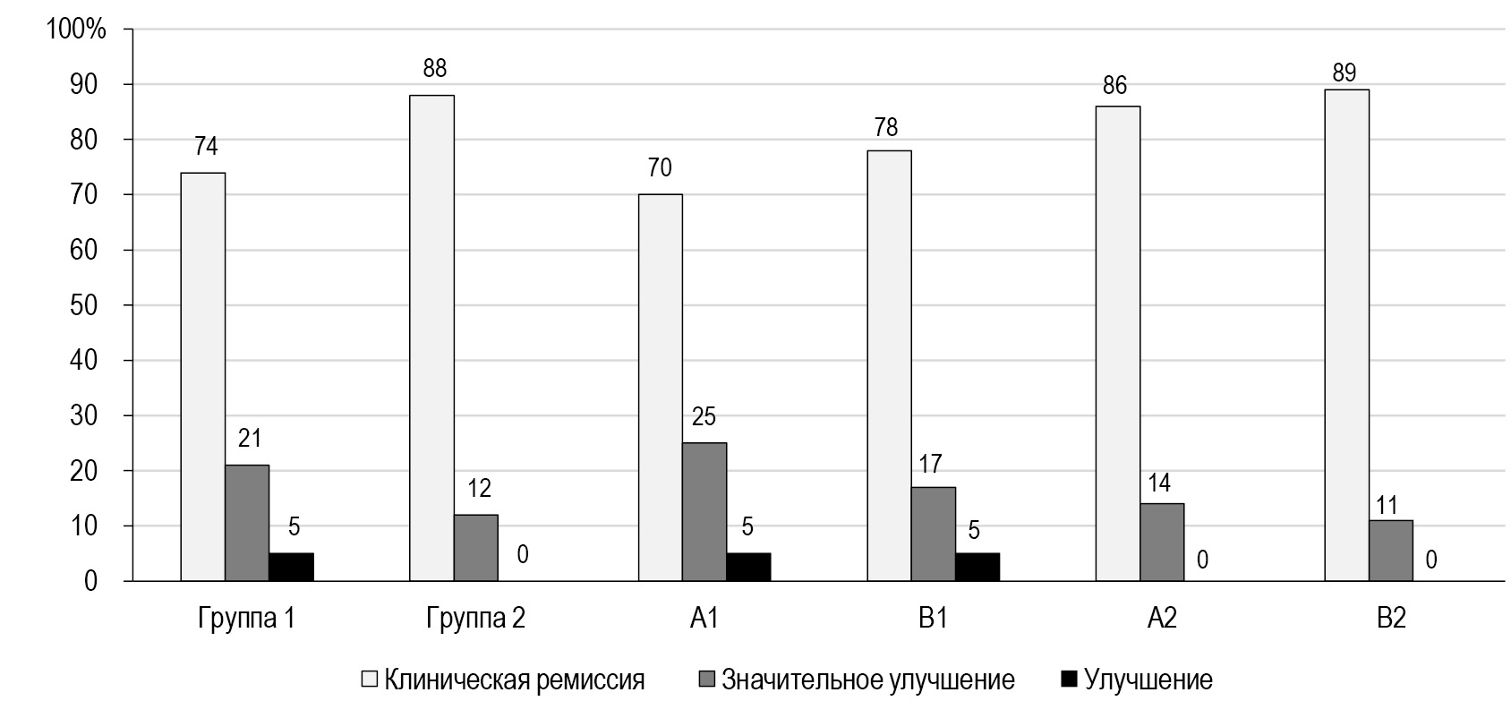 Данные шкалы GSS также свидетельствуют о том, что клиническая ремиссия достоверно чаще наблюдалась в группе комбинированной терапии по сравнению с группой мототерапии (88 и 74% соответственно, p <0,05).