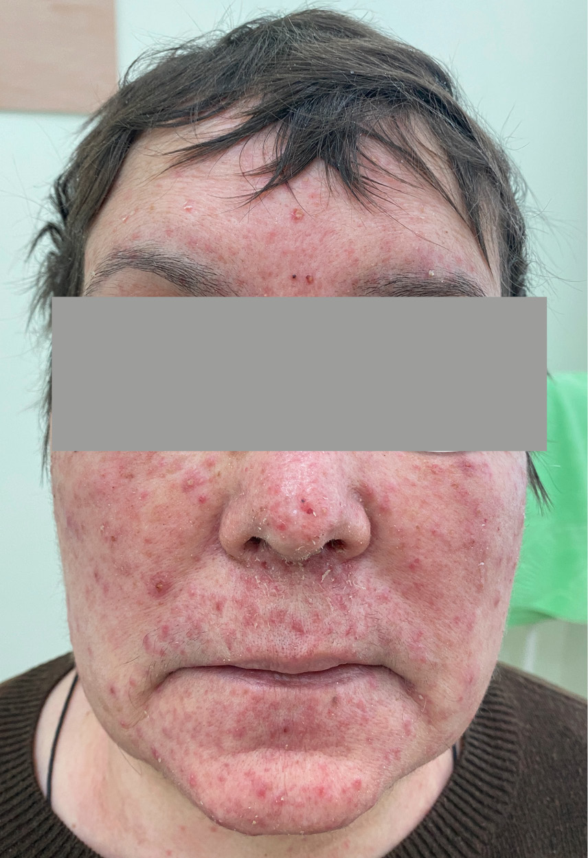 Рис. 4. Акнеподобная сыпь на фоне таргетной противоопухолевой терапии панитумумабом.