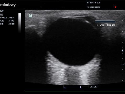 Рис. 1. Сонограмма пациента с повышением внутричерепного давления. Диаметр расширенной оболочки зрительного нерва 5,8 мм