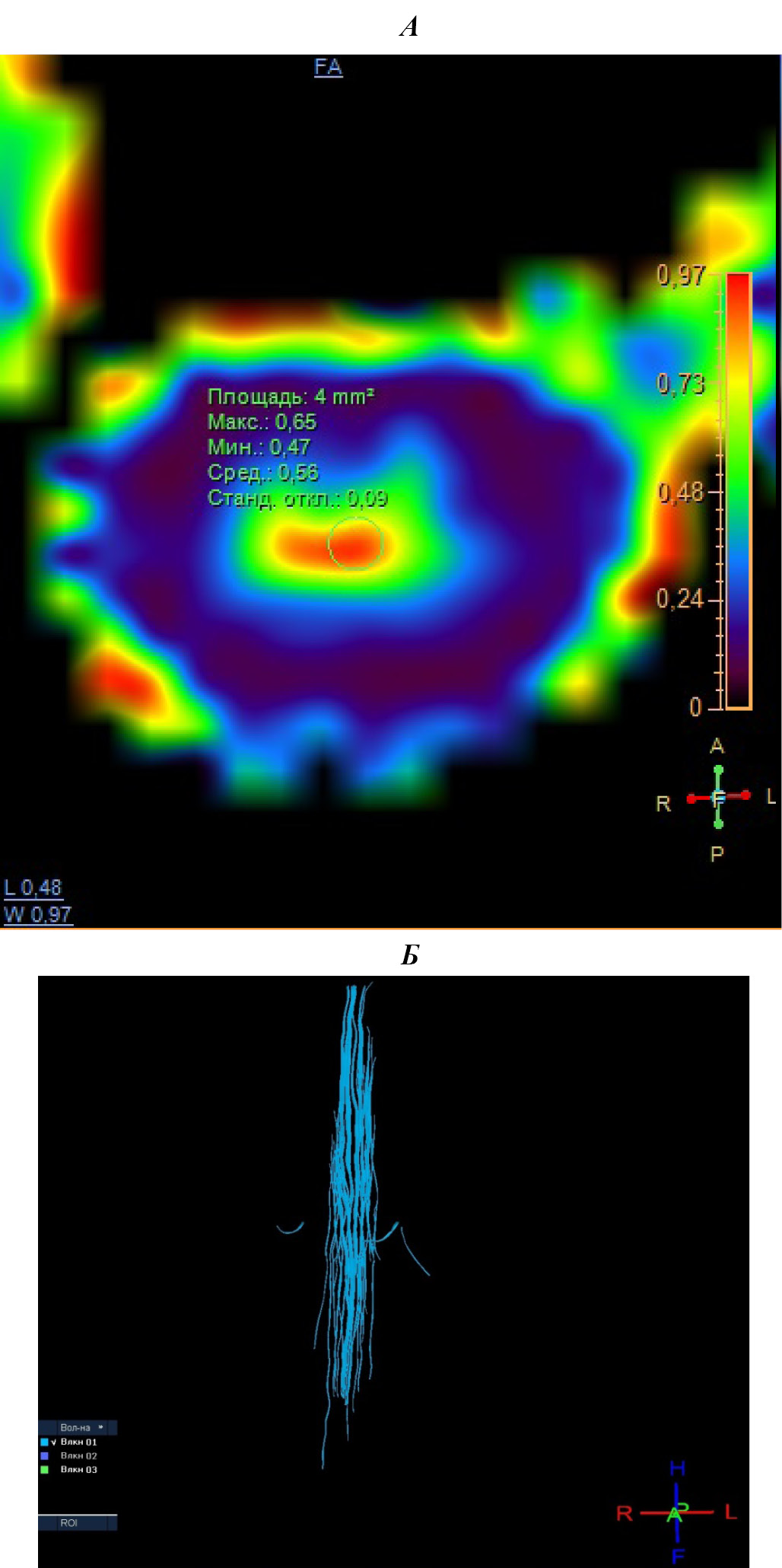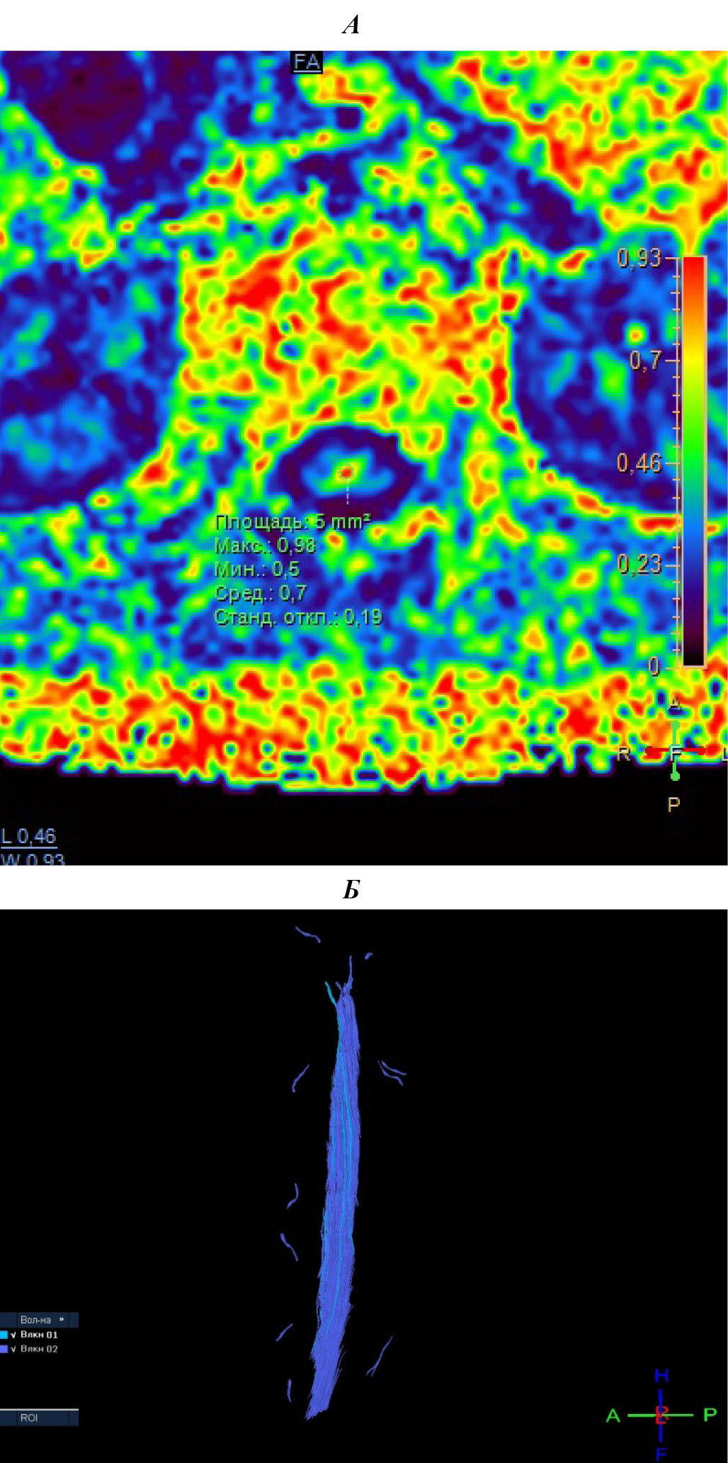Рис. 3. Пациент О., 14 лет, острый период острой воспалительной демиелинизирующей полиневропатии: замеры фракционной анизотропии на 35-е сутки. Применена диффузионно-тензорная методика обследования нервных волокон с получением цифровых значений плотности расположения волокон (А) и оценки их хода (Б).