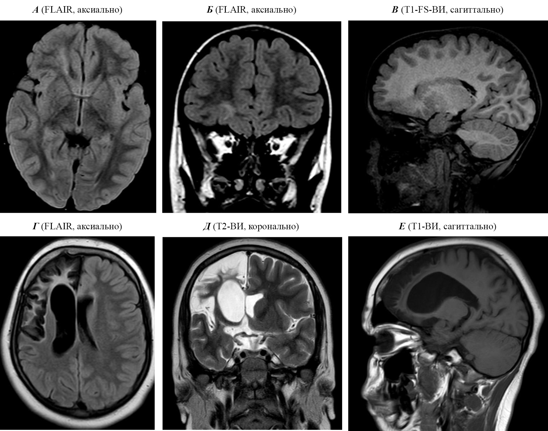 Рис. 4. Пациент Р., 5 лет: атрофия и фокальные корковые дисплазии на структурной магнитно-резонансной томографии. А−В ― фокальная кортикальная дисплазия в полюсном отделе правой лобной доли в виде нечеткого участка, распространяющегося от коры до переднего рога правого бокового желудочка; Г−Е ― кистозно-глиозно-атрофические изменения в правой лобной доле с викарным расширением правого бокового желудочка как исход ранее перенесенного менингоэнцефалита.