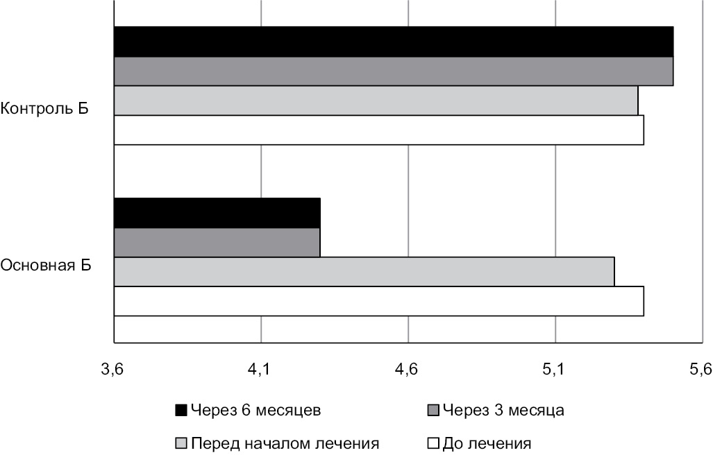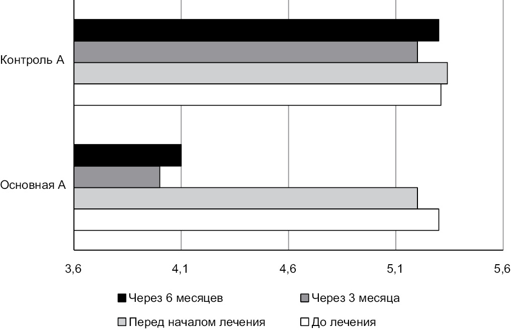 При анализе полученных данных в этой группе через 6 мес. в обеих ее подгруппах показатели практически сохранялись на том же уровне, и в подгруппе А составляли 4,1 ± 0,1 и были ниже исходных на 29%, оставаясь в границах нормы.