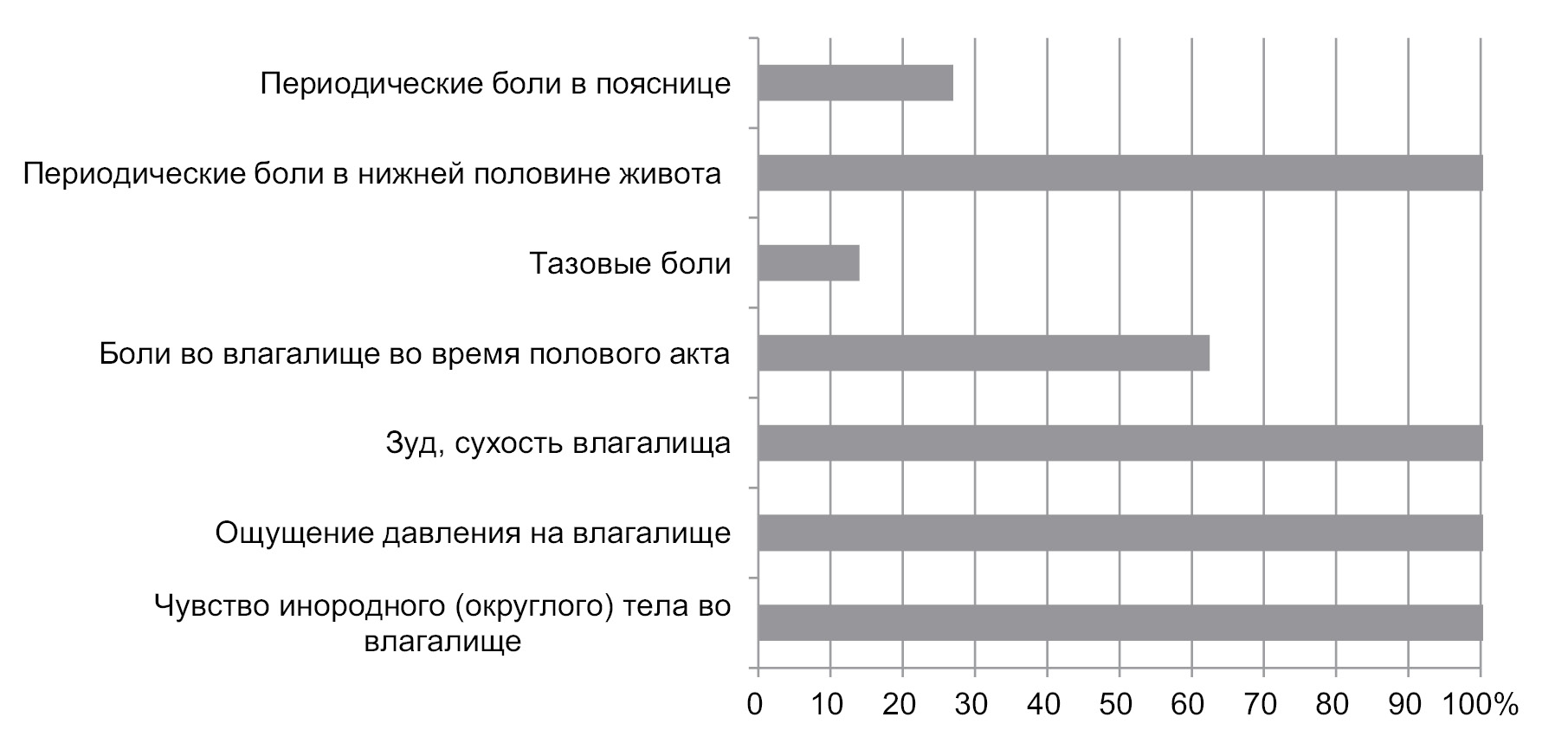 Наиболее частыми жалобами сексуального характера были снижение сексуальной функции (92,5%), изменение отношений с супругом (71,5%), дискомфорт и болезненность во время полового акта ― 67 и 54,5% соответственно, несколько реже пациентки жаловались на сухость и жжение во влагалище (61,5%) и кровянистые выделения после полового акта (31%).