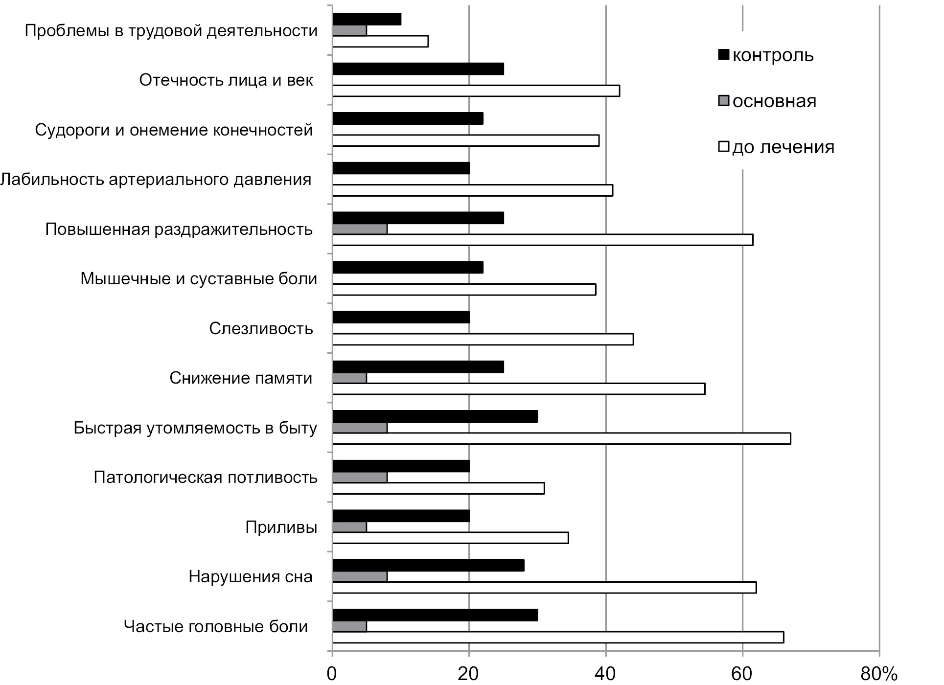 Как свидетельствуют данные рис. 2, из жалоб общего, вегетативного и предклимактерического характера после курса лечения у подавляющего большинства больных основной группы практически исчезли жалобы на частые головные боли (5%), нарушение сна (8%), быструю утомляемость в быту (8%), повышенную раздражительность (5%), снижение памяти (5%), приливы (5%), патологическую потливость (8%), полностью исчезли жалобы на слезливость, мышечные и суставные боли, лабильность артериального давления, судороги и онемение конечностей, отечность лица и век, в среднем на 5% у пациенток уменьшилась масса тела и проблемы в трудовой деятельностью. В контрольной группе жалобы общего, вегетативного и предклимактерического характера сохранялись в 10−30% случаев.