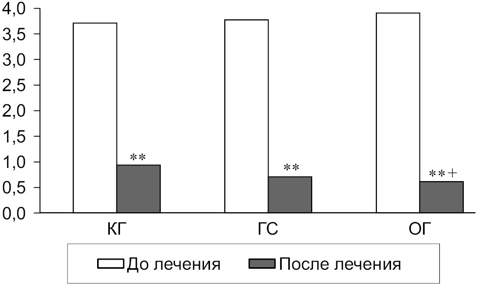 Контрольная группа (n = 38) | До лечения | 3,29 ± 0,10* | 8,25 ± 0,32** | 2,81 ± 0,07** | 2,49 ± 0,13** |