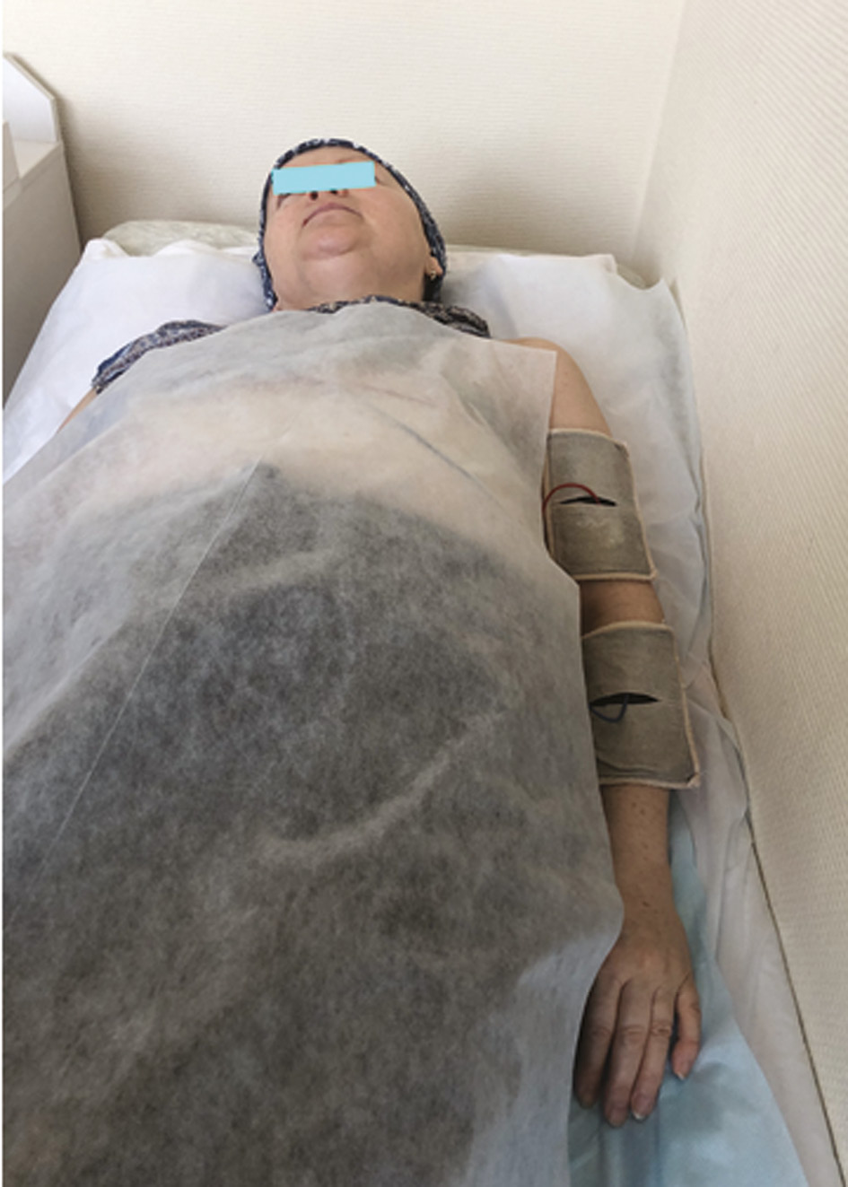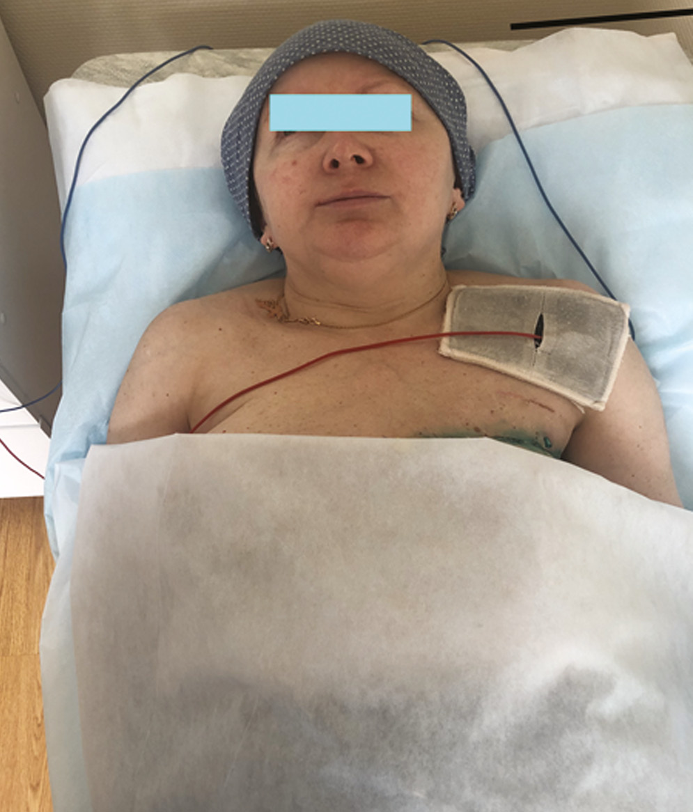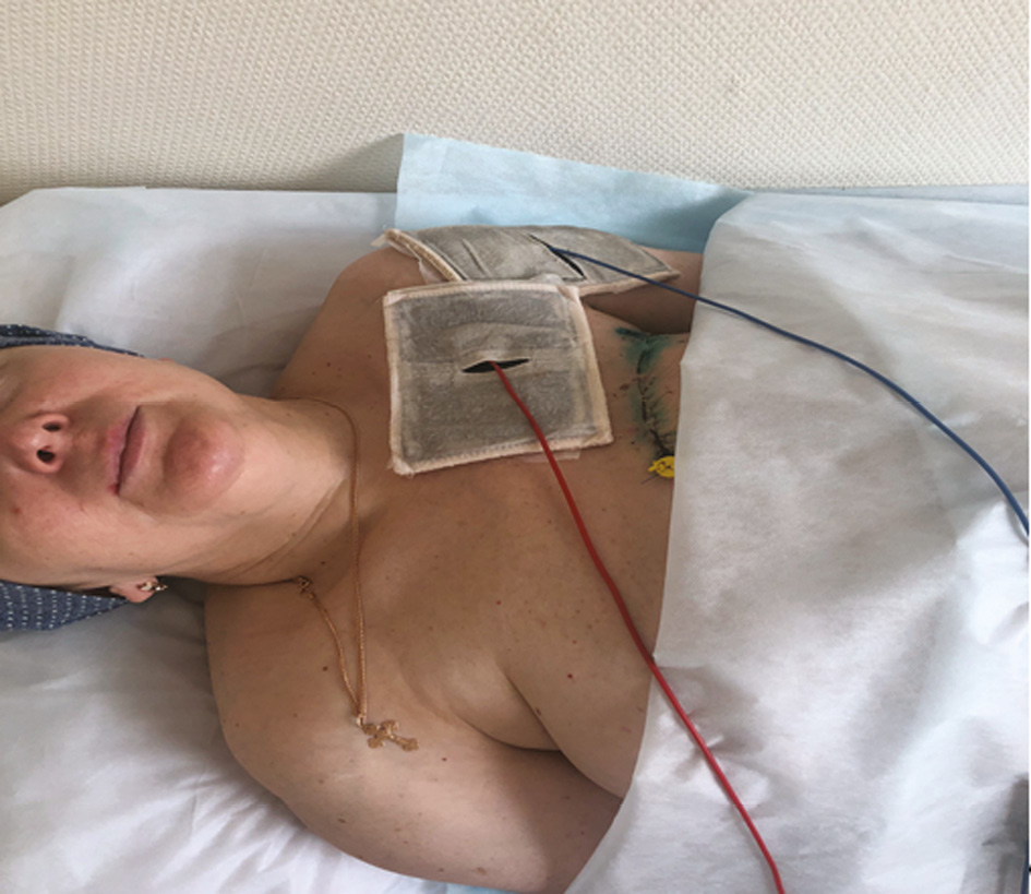 1-я группа (основная, n = 24) включала женщин в раннем послеоперационном периоде (2–4-е сут после операции), которым на фоне стандартной терапии проводились 12 процедур электротерапии апериодическими токами малой силы и низкого напряжения с беспорядочно меняющимися (от 200 до 2000 Гц) частотой и амплитудой (флюктуирующие токи) с помощью аппарата для флюктуризации АСБ-2М («Каскад-ФТО», Россия, рег. уд. от 15.08.2016 № ФСР 2011/11395), Первые четыре процедуры проводили с использованием биполярного симметричного флюктуирующего тока (форма тока I), который обладает более выраженным противовоспалительным и рассасывающим действием. Один электрод с гидрофильной прокладкой размером 150 см2, смоченной теплой водой, накладывали на передневнутреннюю поверхность плечевого сустава прооперированной конечности (рис. 1). Второй электрод аналогичного размера располагали поперечно. Параметры тока: сила до 2 мА, до ощущения приятной мягкой вибрации, время воздействия 10 мин.