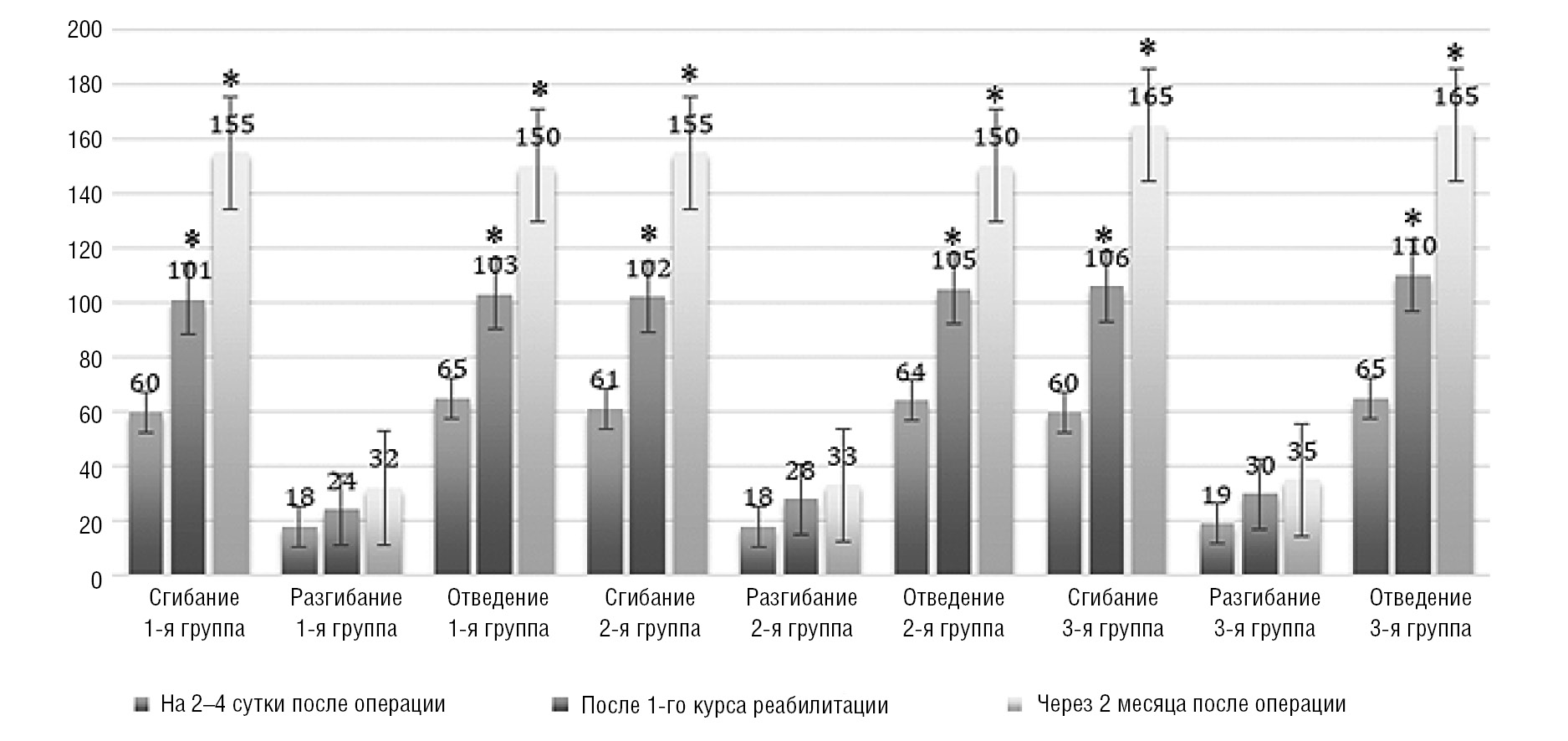 Рис. 4. Сравнительная характеристика объема движений в плечевом суставе на стороне операции у пациенток трех групп в одинаковые сроки после оперативного лечения рака молочной железы (*р < 0,05 для всех показателей при сравнении до и после лечения)