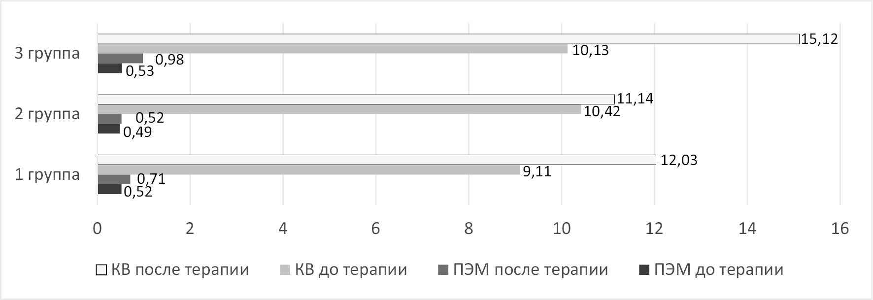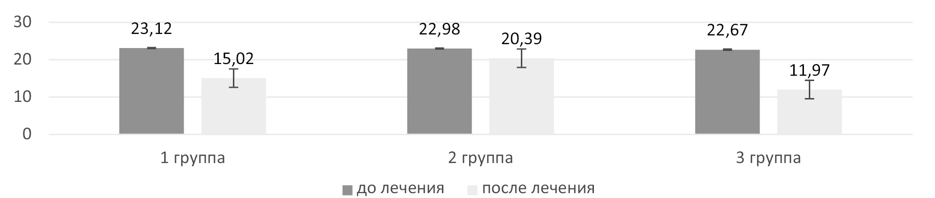 Несмотря на то, что после лечения снижение показателя ТЭПВ у всех пациентов внутри групп было статистически достоверно, у большинства исследуемых данный показатель все еще соответствовал нижней границе нормы (см. рис. 3), самый высокий показатель оказался у пациентов 2-й группы. Разница уровня ТЭПВ у пациентов 1-й и 2-й, а также 2-й и 3-й групп была статистически достоверна (р < 0,05). Разница уровня ТЭПВ у пациентов 1-й и 3-й групп статистически недостоверна (p > 0,05).
