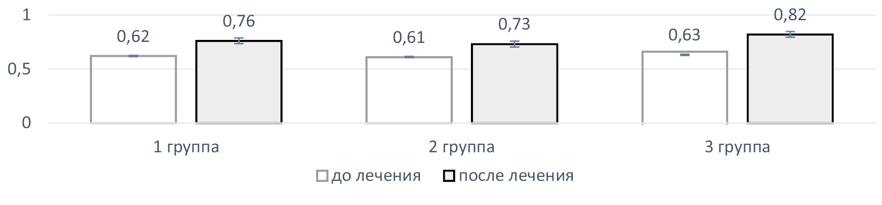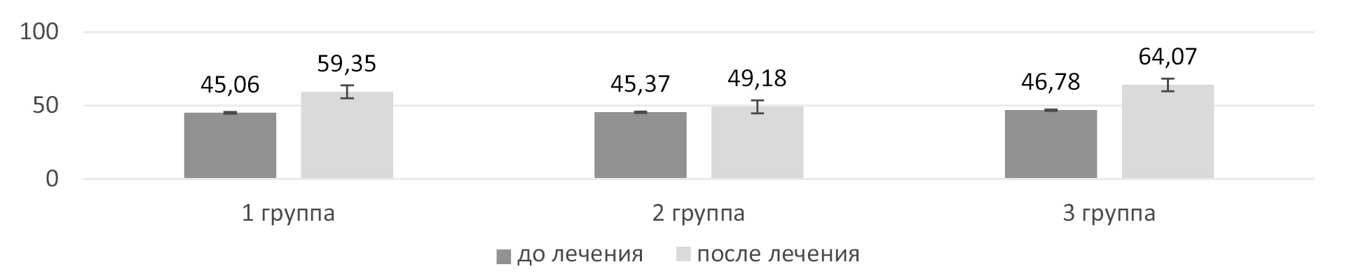 В 1-й группе показатель увеличился на 14,1%, с 45,06 ± 2,78 до 59,35 ± 2,79 (р < 0,05). Во 2-й группе показатель увеличился на 7,8%, с 45,37 ± 3,01 до 49,18 ± 2,96 (р < 0,05). В 3-й группе показатель увеличился на 27%, с 46,78±1,98 до 64,07±2,75 (р < 0,05) (рис. 2).