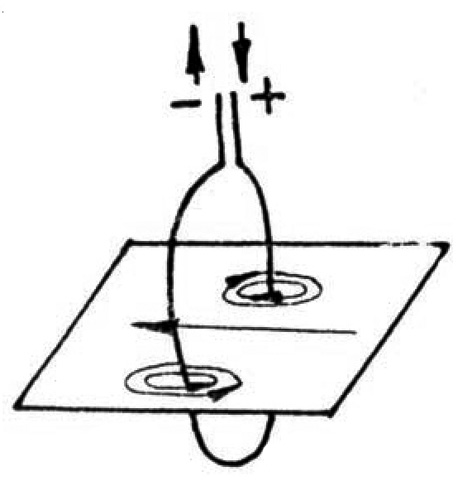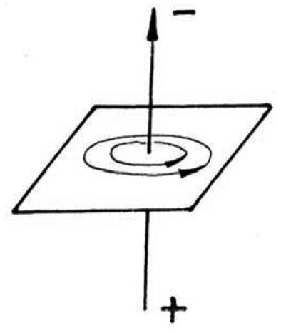 Движущийся электрический заряд является источником не только ЭП, но и МП. Силовые линии МП перпендикулярны линиям ЭП, они имеют форму концентрических замкнутых колец, окружающих траекторию движения электрического заряда, при этом максимальная плотность силовых линий имеет место непосредственно возле движущегося заряда. Направление силовых линий МП определяется по правилу буравчика: рукоятка буравчика правого вращения при поступательном перемещении буравчика вдоль траектории движения электрического заряда описывает круги, совпадающие с направлением силовых линий поля (рис. 1).