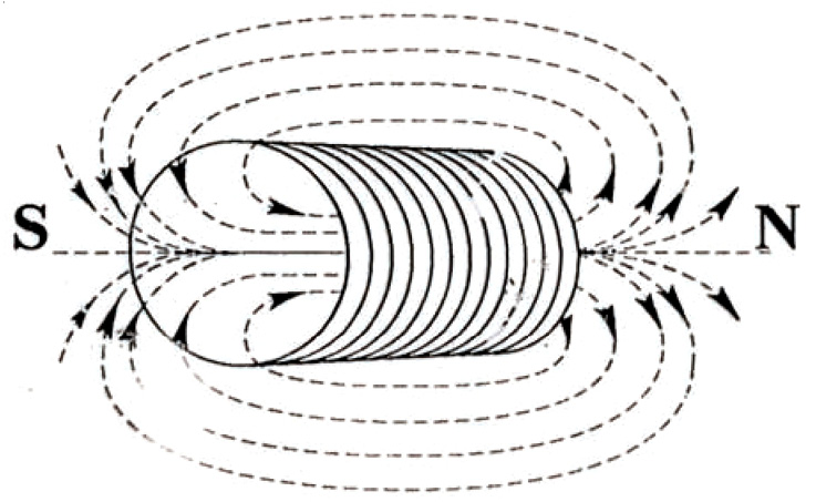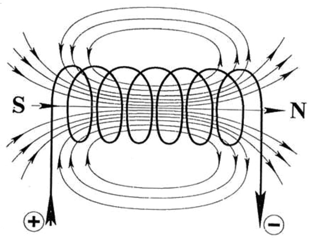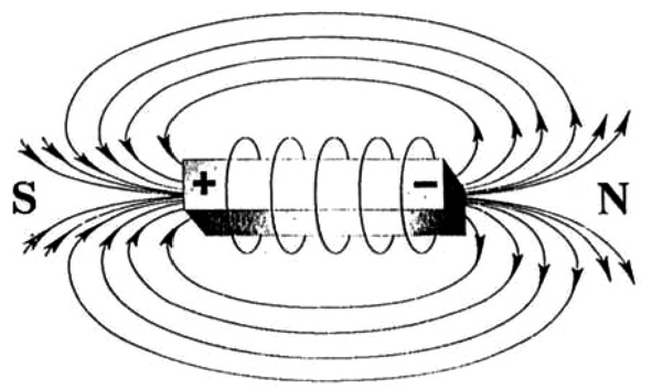 МП катушки является суммой полей отдельных витков. Силовые линии поля катушки представляют собой концентрические замкнутые кольца. Они проходят через полость катушки, выходят из ее апертуры, огибают катушку снаружи и замыкаются в противоположной апертуре (рис. 4). Направление магнитных силовых линий зависит от направления тока в катушке и определяется по правилу буравчика. Апертура катушки, из которой выходят силовые линии МП соответствует ее северному полюсу (N), а противоположная апертура, в которую входят силовые линии ― ее южному полюсу (S). Наибольшая плотность силовых линий (напряженность) поля имеет место в полости катушки и в ее апертурах. Величина напряженности МП катушки кратна числу ее витков.