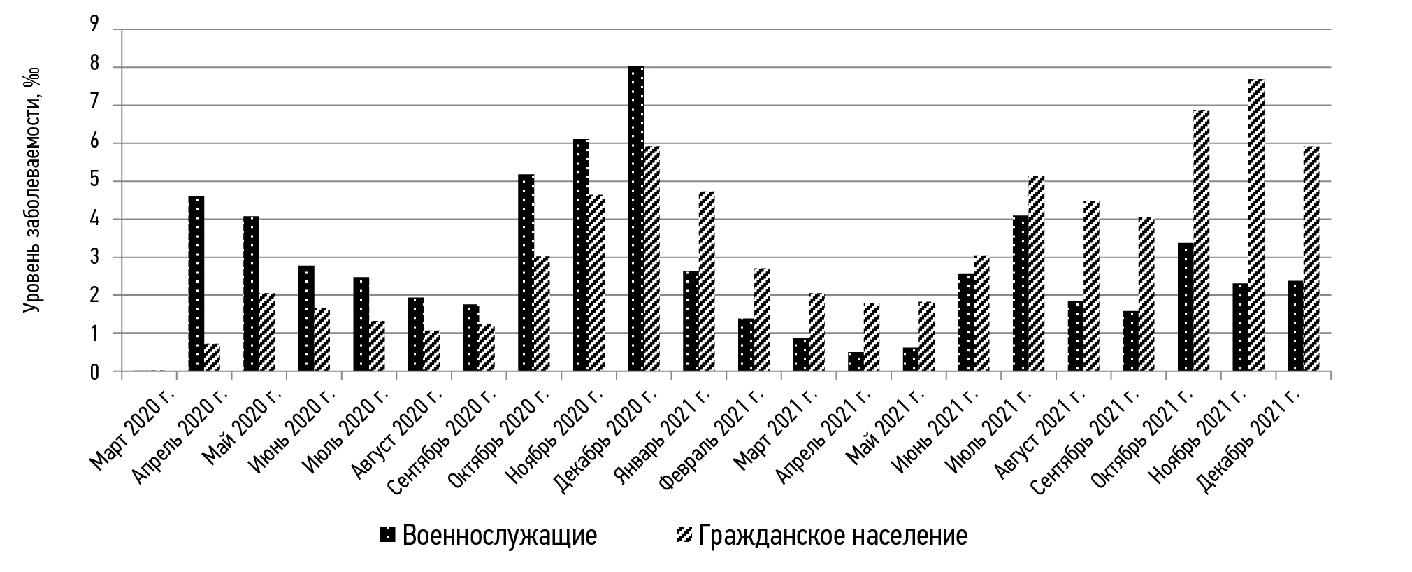 Рис. 1. Динамика заболеваемости личного состава Западного военного округа COVID-19 в 2020–2021 гг. в сравнении с заболеваемостью гражданского населения