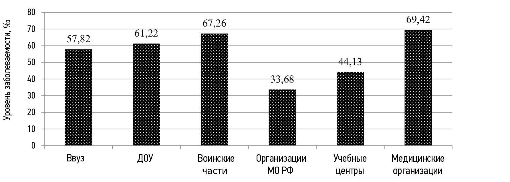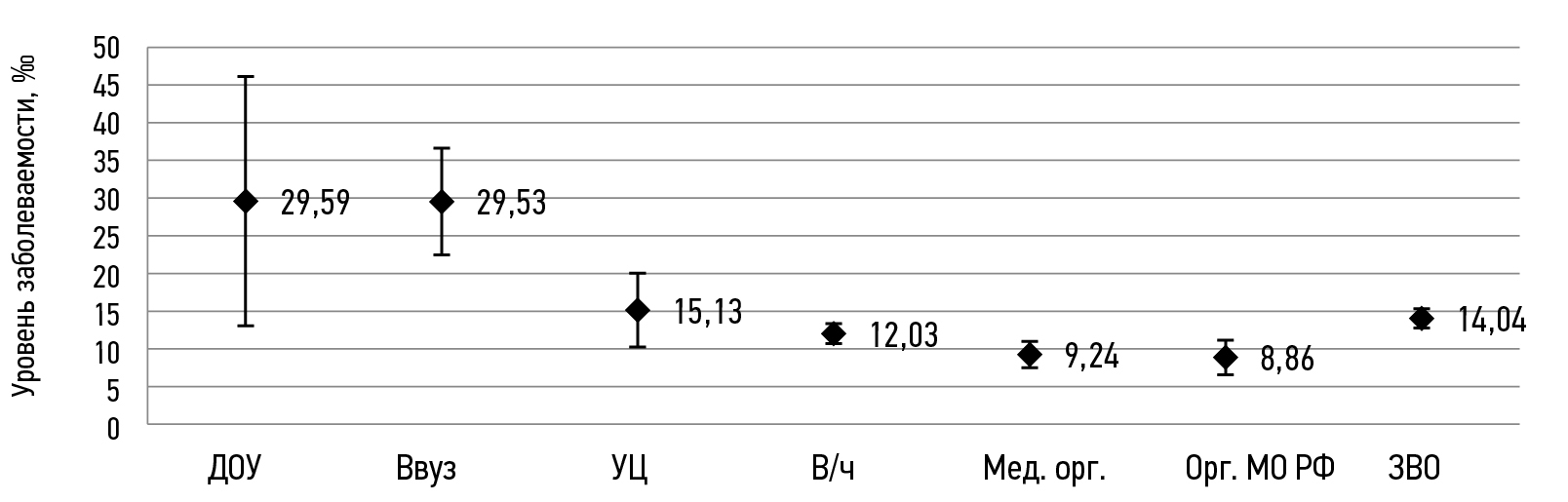 Наибольший вклад в заболеваемость личного состава округа COVID-19 внесли военнослужащие и гражданский персонал воинских частей (52,7% от всех заболевших), ввузов (21,4%) и организаций Минобороны России (9,3%). Наибольший уровень заболеваемости на 1000 человек регистрировался среди персонала медицинских организаций, личного состава воинских частей и образовательных организаций (ДОУ и ввуз) (рис. 2). Вследствие удаленности от лабораторных баз диагностика COVID-19 в учебных центрах (УЦ) была организована в меньшем объеме, чем в прочих воинских частях. Ретроспективный анализ показывает, что до 30% легких форм заболевания COVID-19 в УЦ могли проходить в медицинских пунктах с диагнозом острого респираторного заболевания.