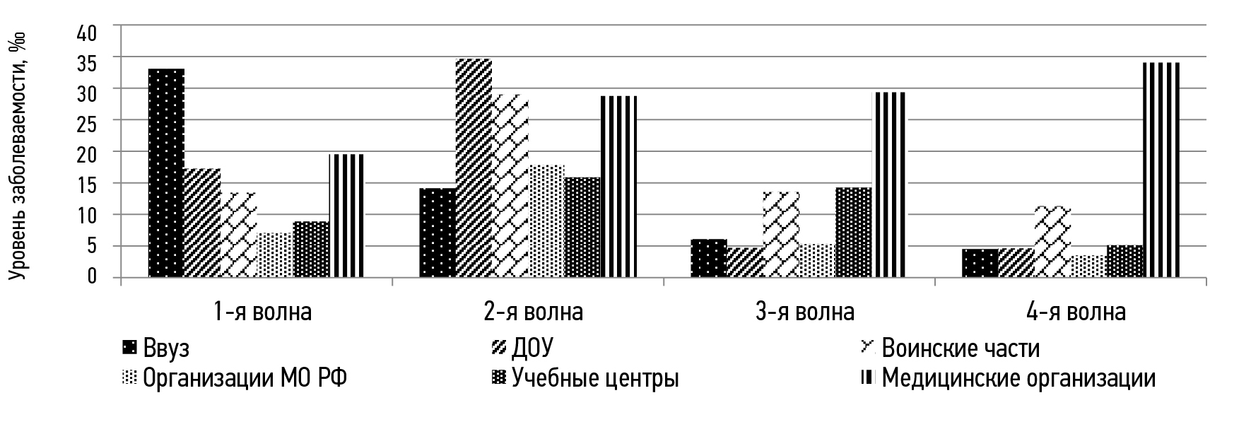 При этом в течение всех четырех эпидемических волн показатели заболеваемости в зависимости от особенностей несения военной службы значительно менялись. В период первой волны наибольший уровень заболеваемости отмечался среди личного состава образовательных организаций (ввузы и ДОУ) и медицинских организаций (рис. 3).