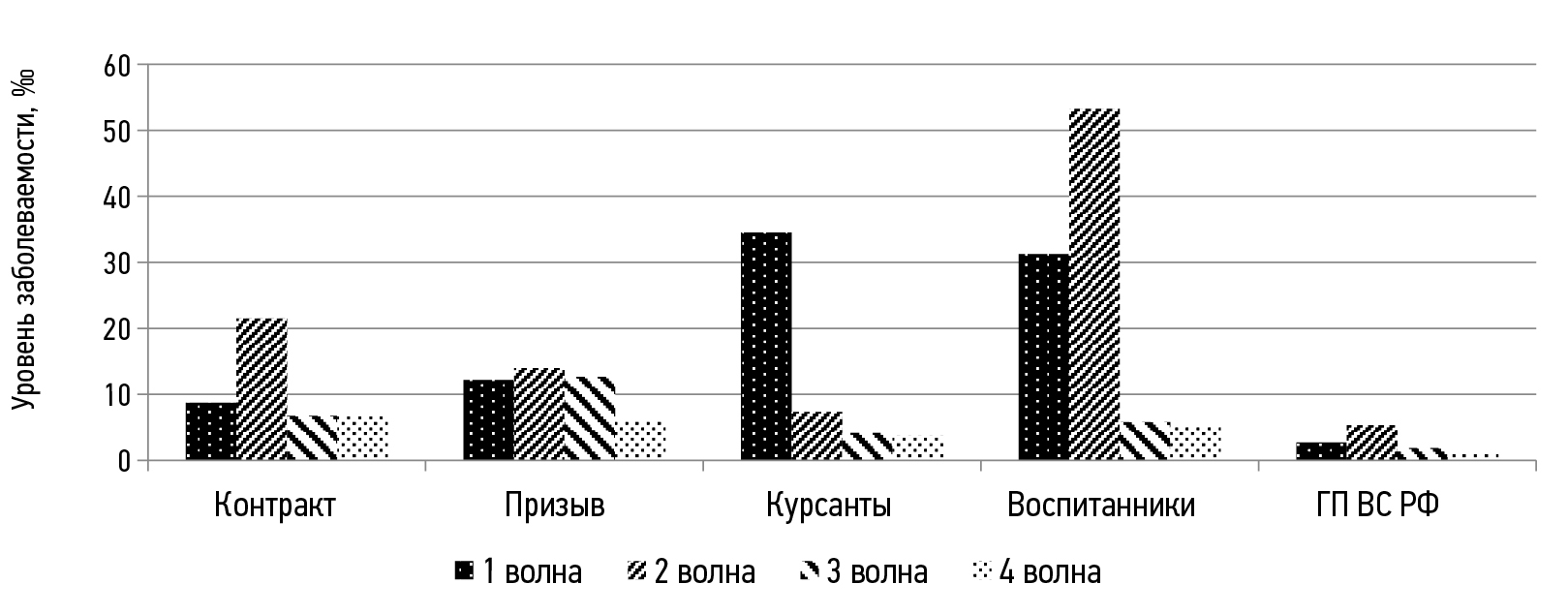 Наибольший уровень заболеваемости COVID-19 за период наблюдения регистрировался среди воспитанников ДОУ (95,27‰) и курсантов ввузов (49,84‰), а наименьший — среди гражданского персонала (11,09‰). Уровень заболеваемости военнослужащих по контракту и военнослужащих по призыву был близок и составил 43,87 и 44,80‰ соответственно. В период первой эпидемической волны наибольший уровень регистрировался в ввузах и ДОУ. Во вторую волну — воспитанников ДОУ и военнослужащих по контракту (рис. 4).